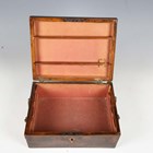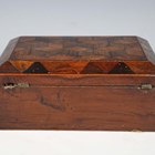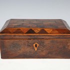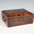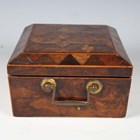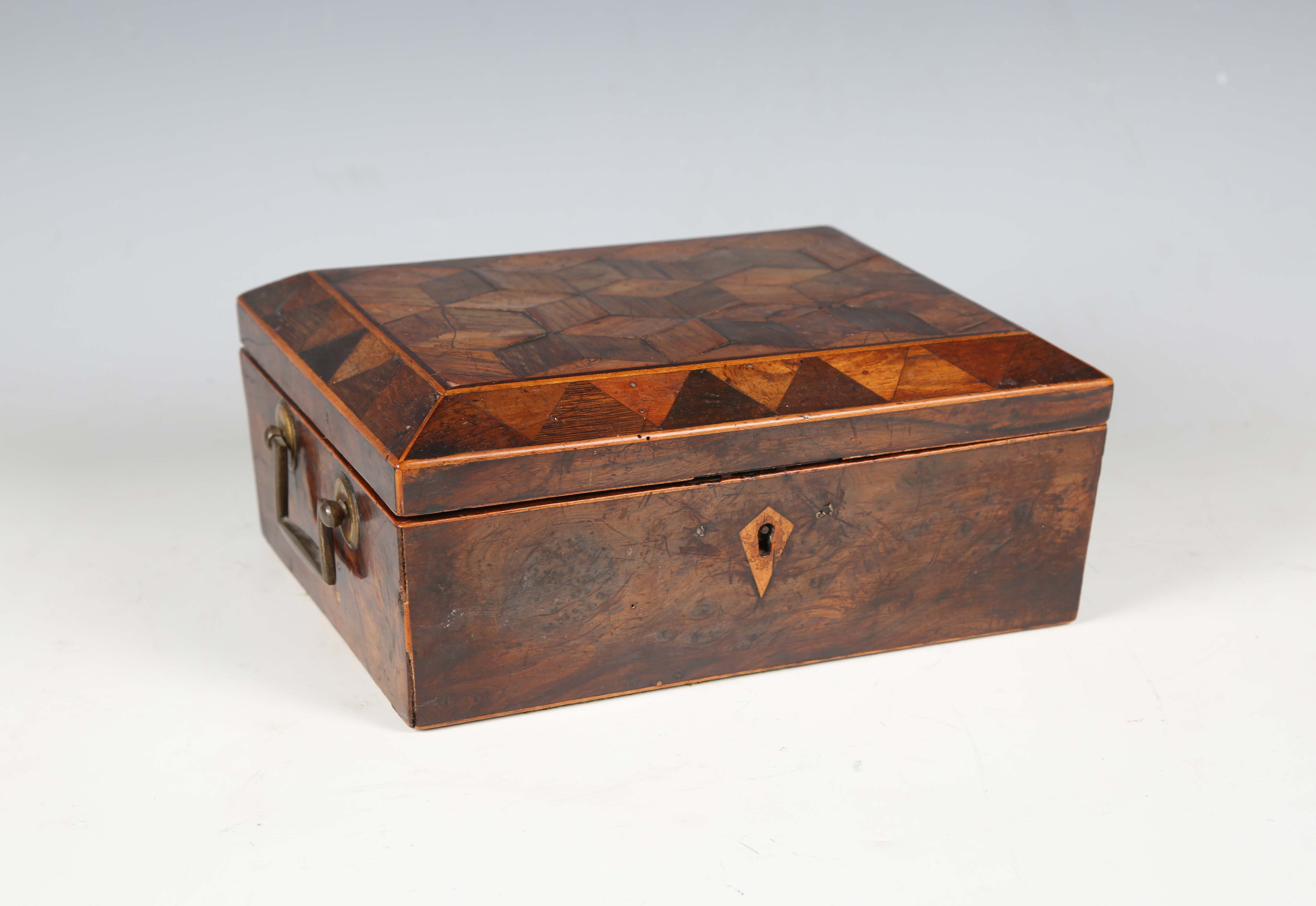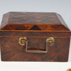 A Regency yew and specimen parquetry workbox of sarcophagus form, width 23.5cm (some faults).