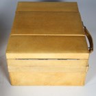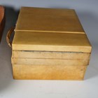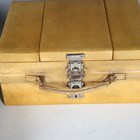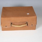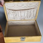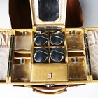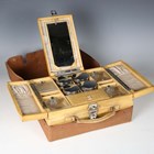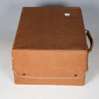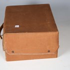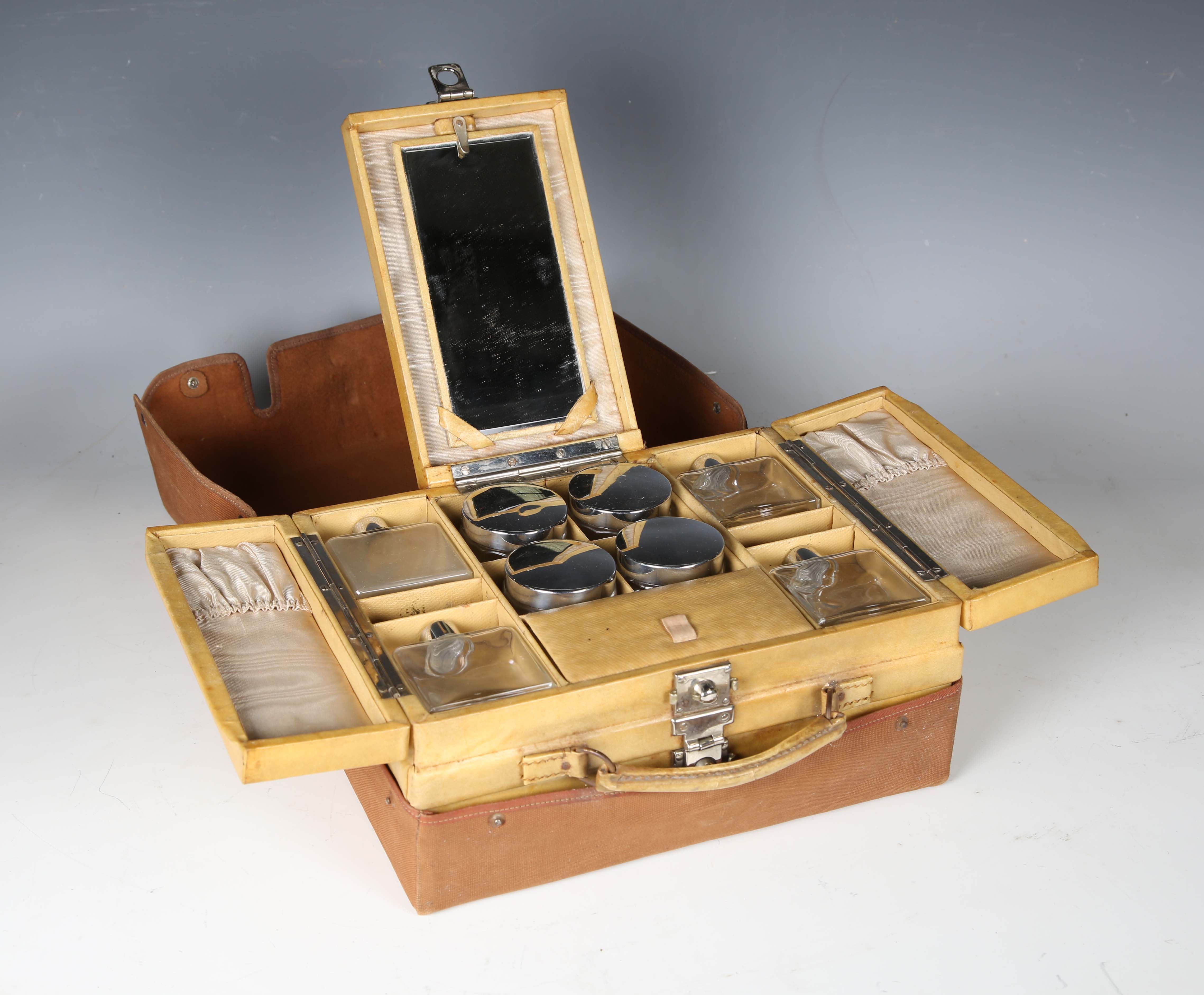 A mid-20th century vellum two-tier vanity case, the hinged lid containing various glass bottles, width 29cm, within a canvas cover.