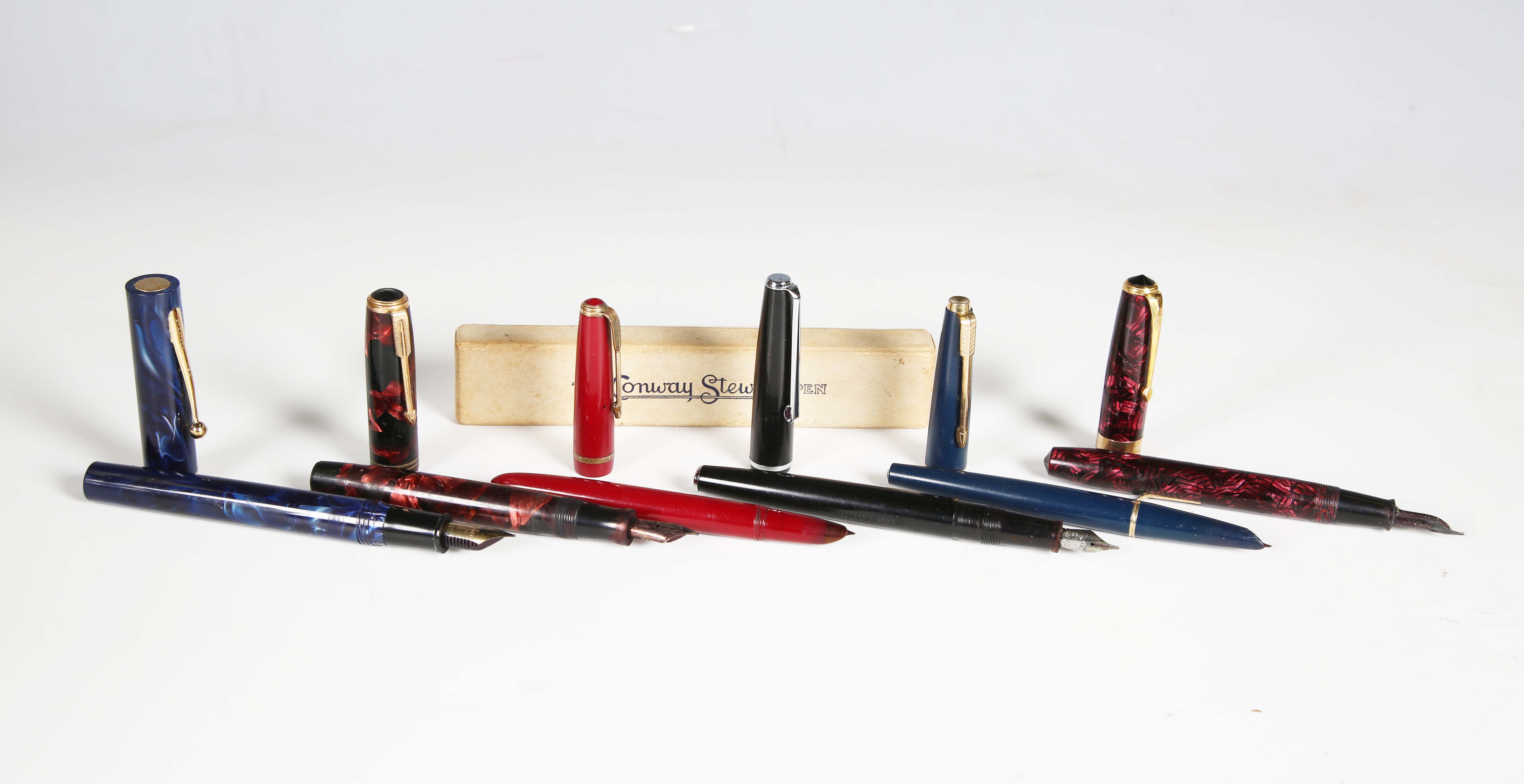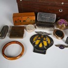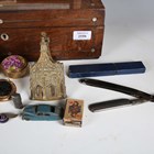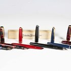 A small group of collectors' items, including six fountain pens, an AA badge and a brass door knocker.