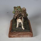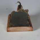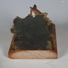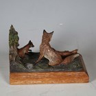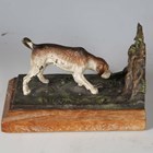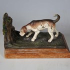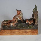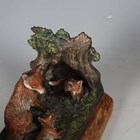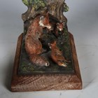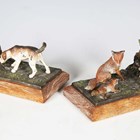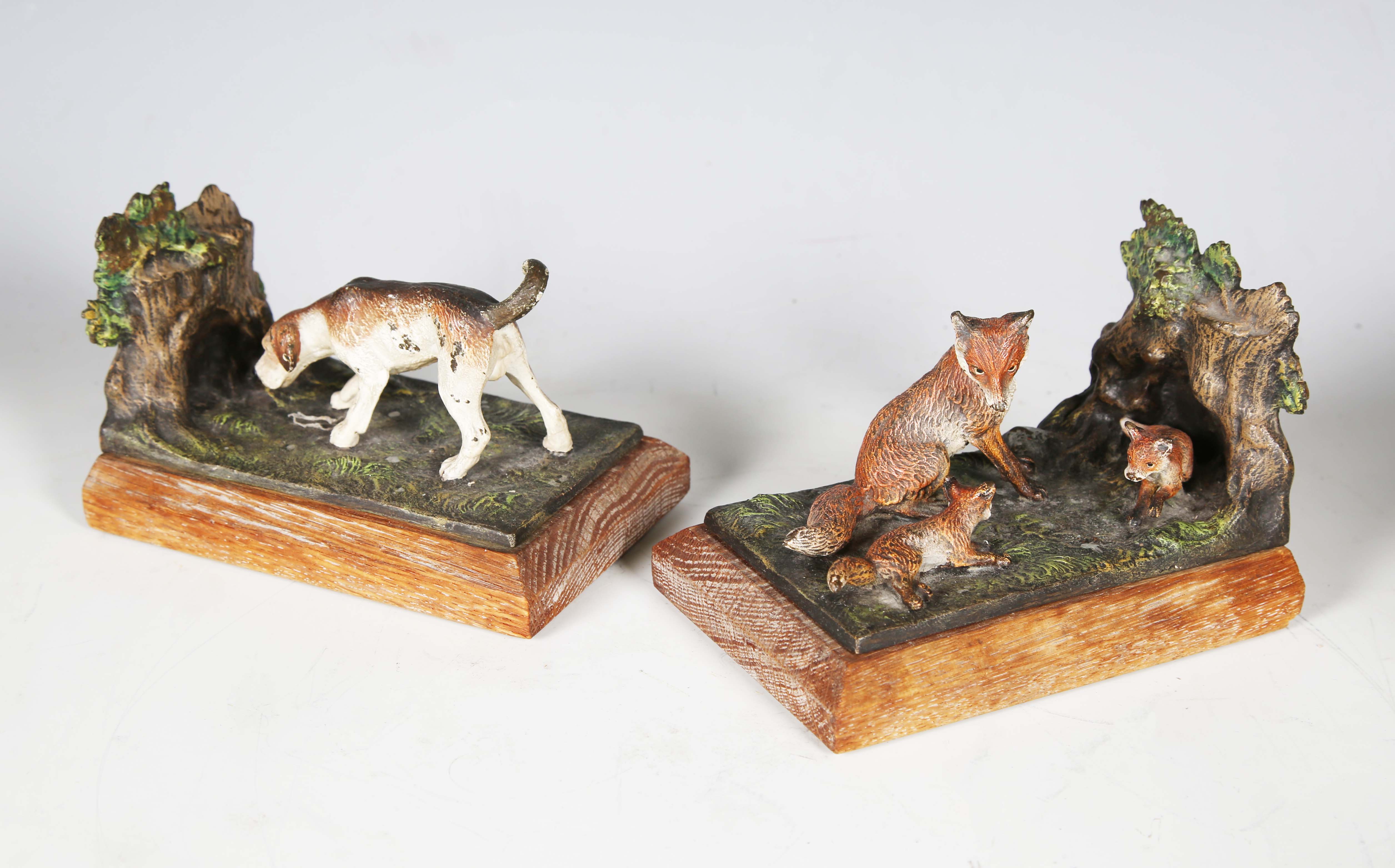 A pair of early 20th century cold painted cast bronze bookends, one in the form of a hound, the other as a family of foxes, both raised on oak bases, height 9cm, length 14cm.