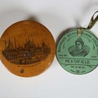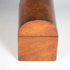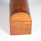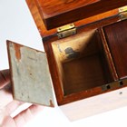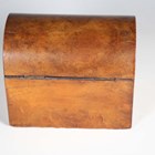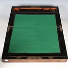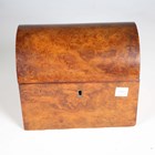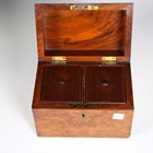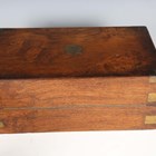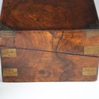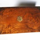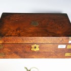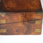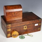 A Victorian walnut and brass bound writing slope, width 40cm, together with a Victorian burr walnut tea caddy, a Mauchline ware box, decorated with 'The Pavilion, Brighton', and a Victorian card 'Ward' label.