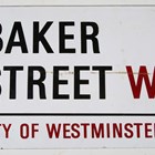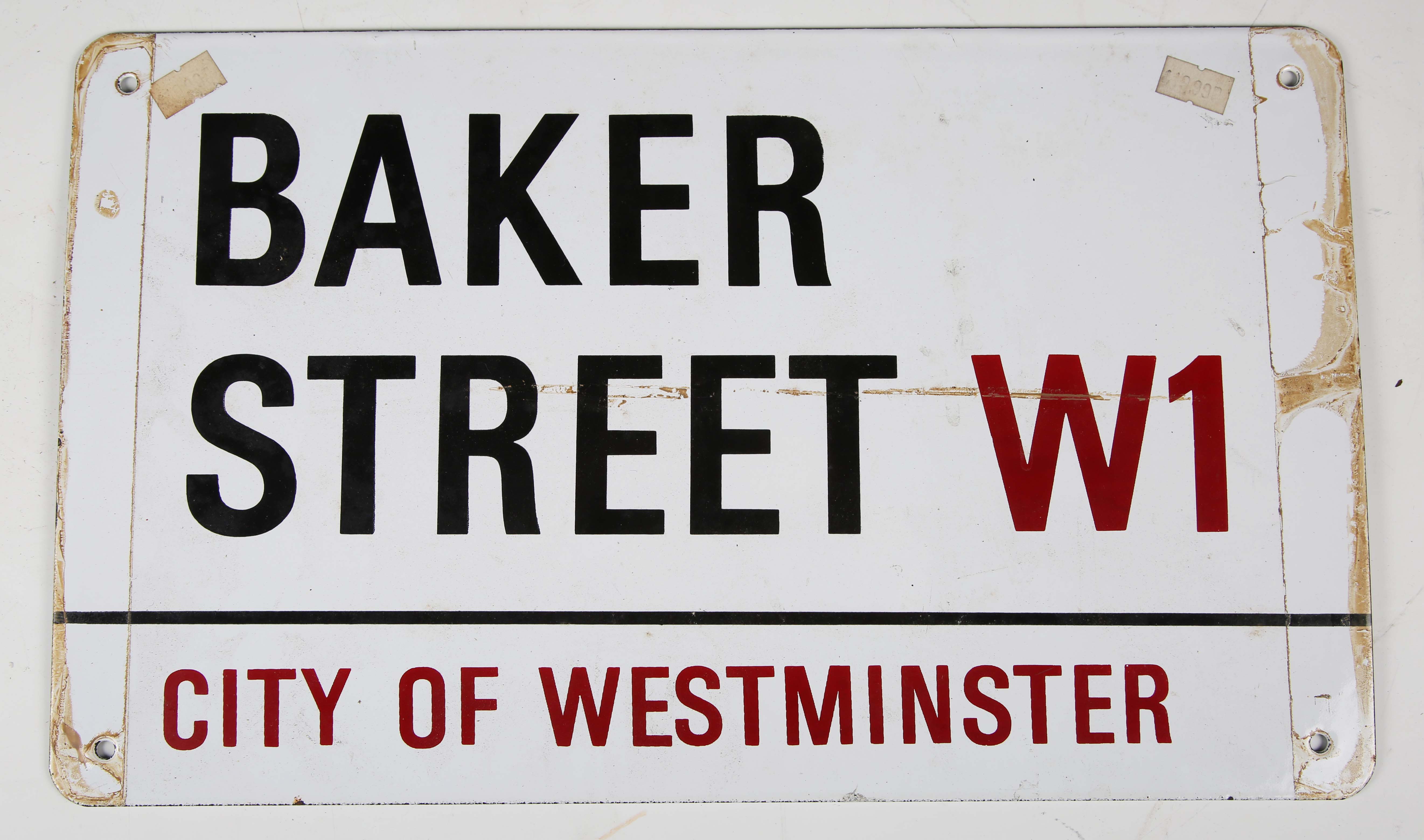 An enamel street sign for 'Baker Street W1 City of Westminster', 23cm x 38cm.