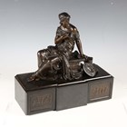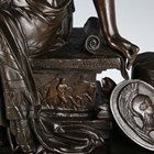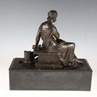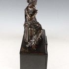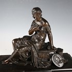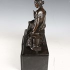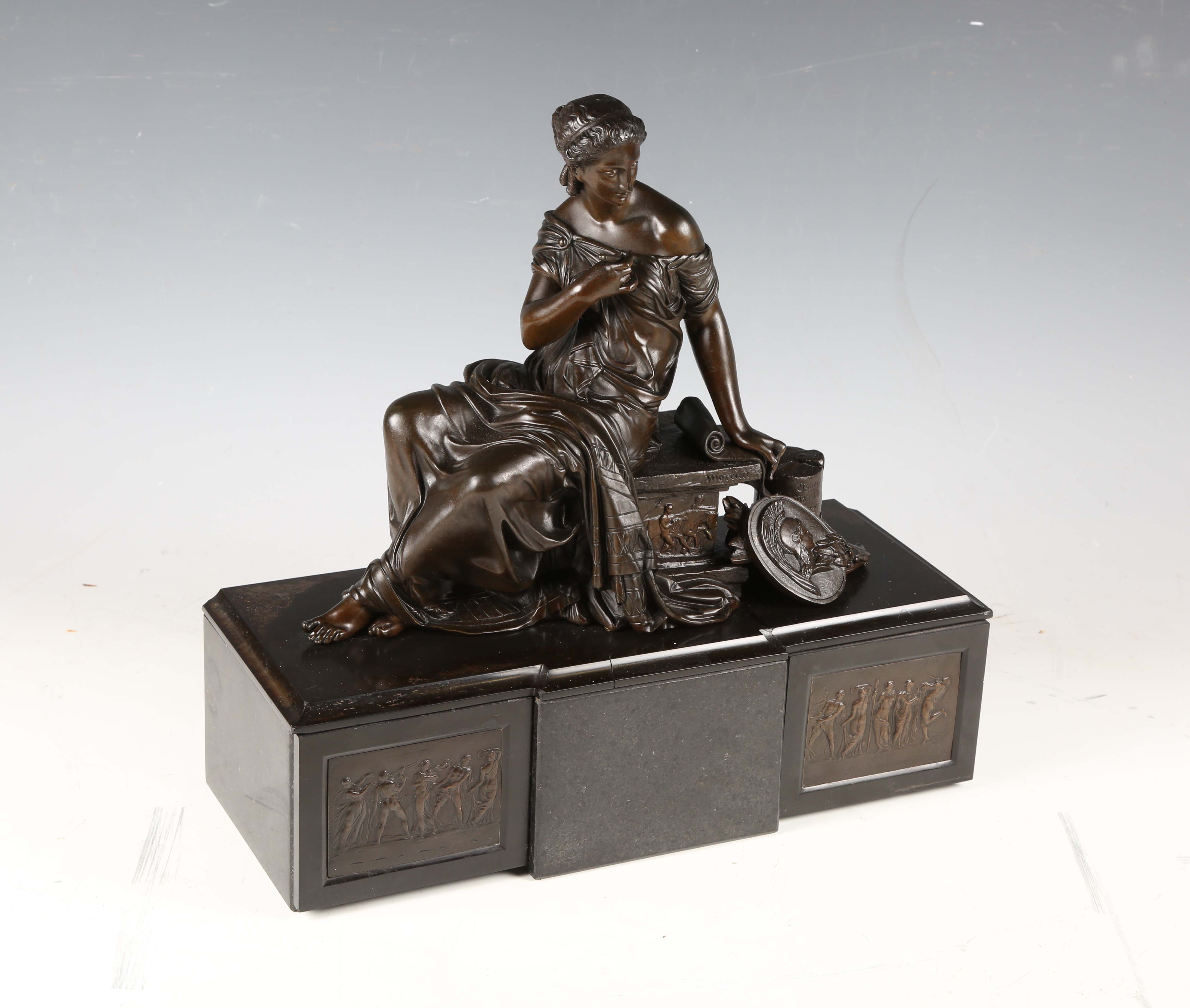 After Moreau - a 19th century brown patinated cast bronze figure of a seated classical lady, raised on a bronze mounted slate pedestal, width 38cm (formerly part of a mantel clock).