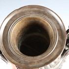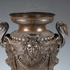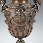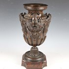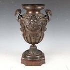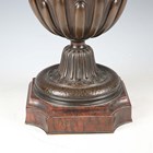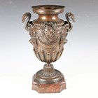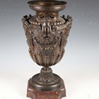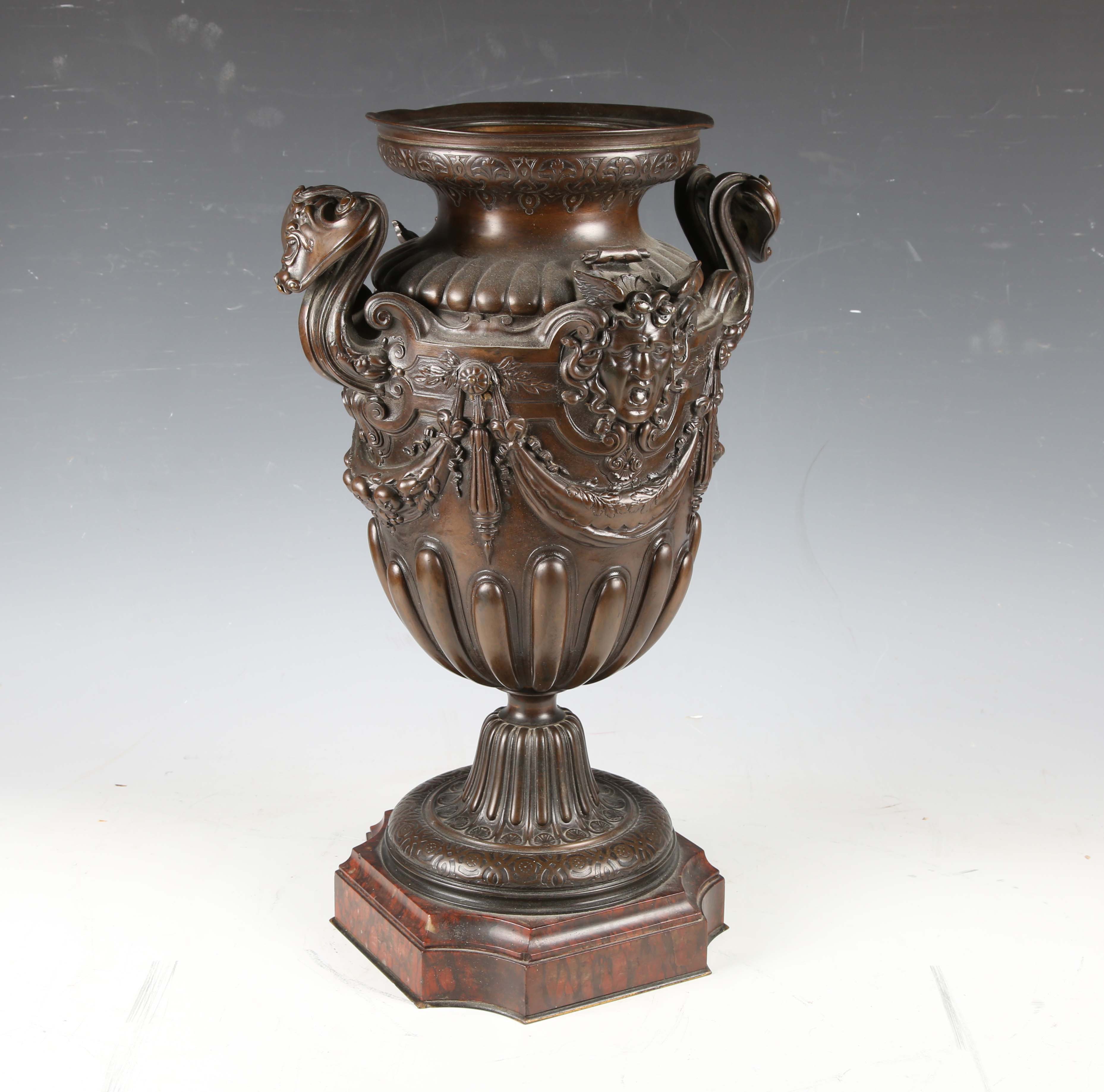 A fine late 19th century French brown patinated cast bronze urn, the half-reeded body cast with gorgon masks and fruit swags between scrolling handles, the flared circular pedestal raised on a shaped rouge marble plinth, height 49.5cm.