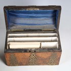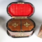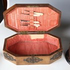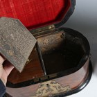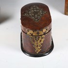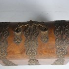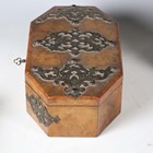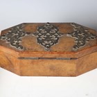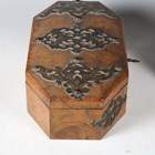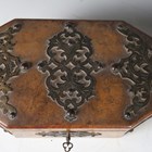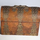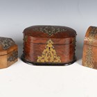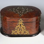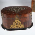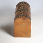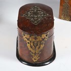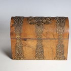 A mid-Victorian Gothic Revival burr walnut and brass mounted dome-topped letterbox, width 22cm, together with a similar tea caddy and workbox.