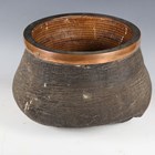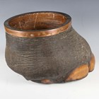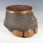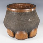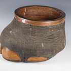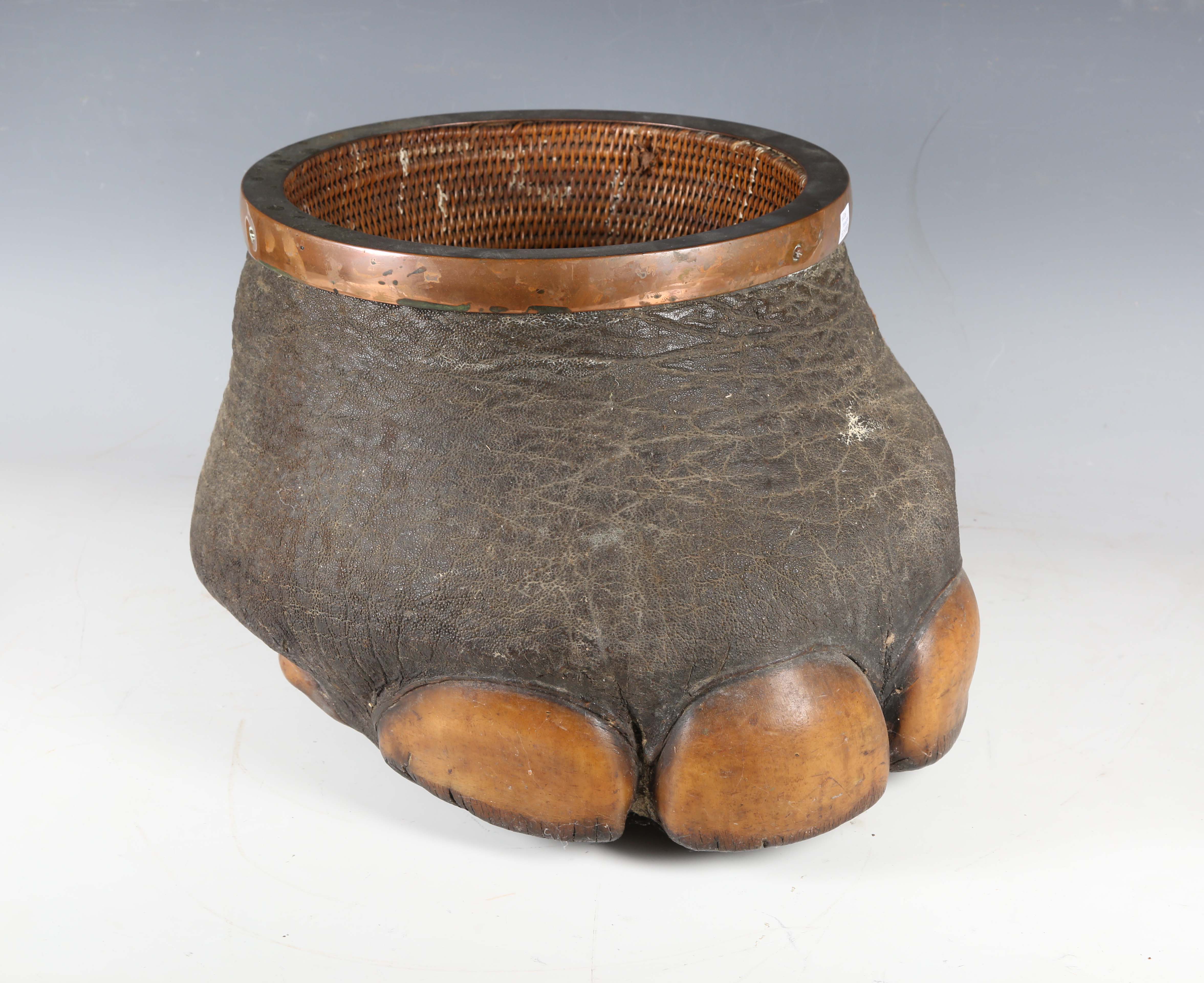 A late 19th/early 20th century taxidermy elephant's foot wastepaper basket with woven rattan interior and copper mounted rim, height 28cm.