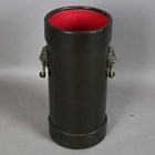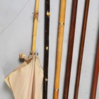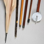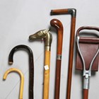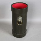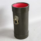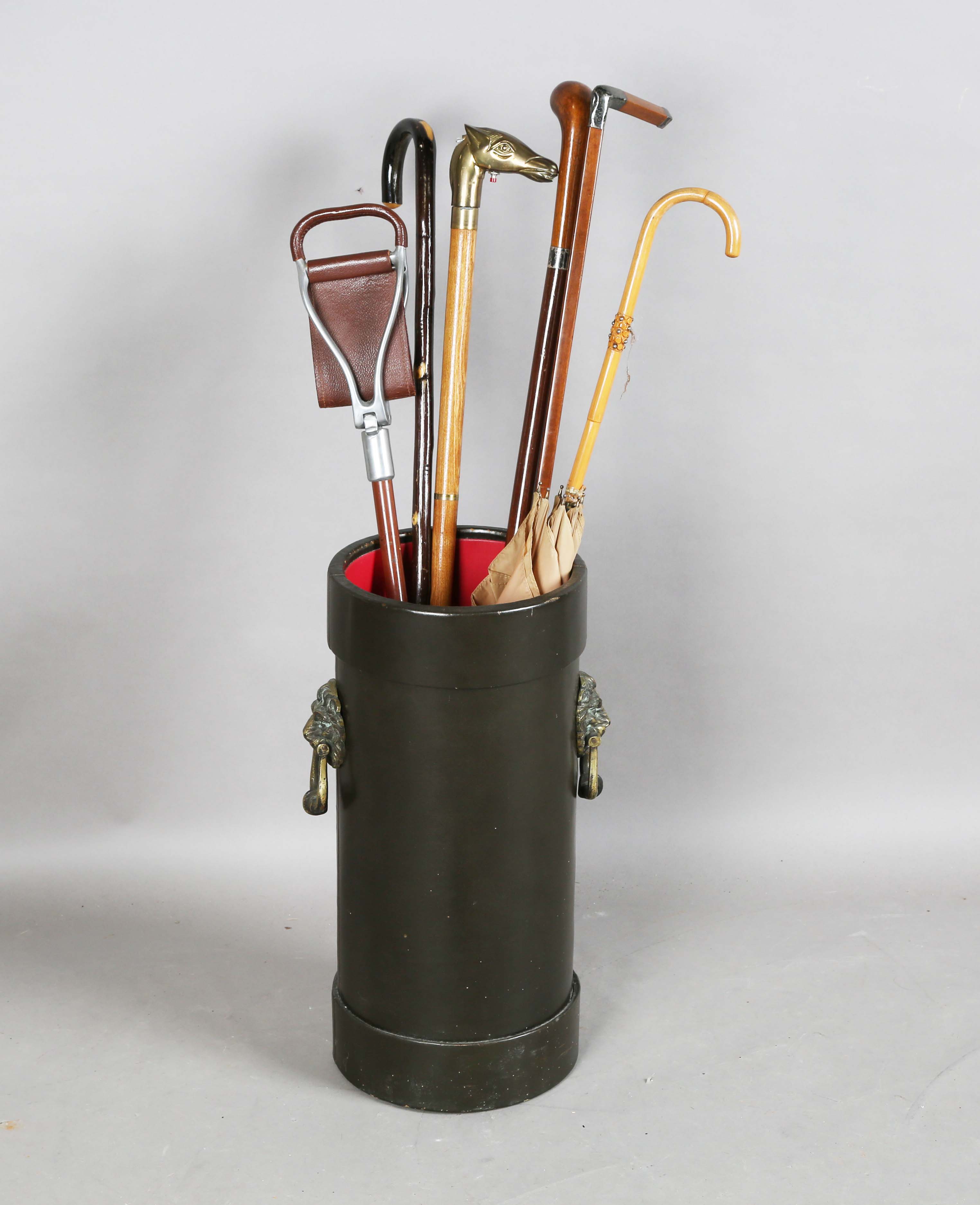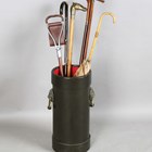 A group of five various walking sticks, a shooting stick and a parasol, all within a leather stickstand in the form of a cordite carrier.