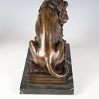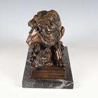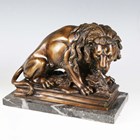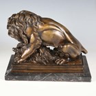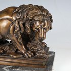 After Antoine-Louis Barye - a modern brown patinated cast bronze model of a lion having caught a wild boar, raised on a black hardstone plinth, width 29cm.