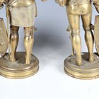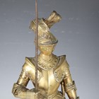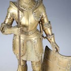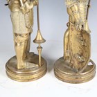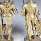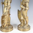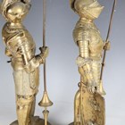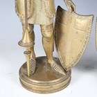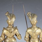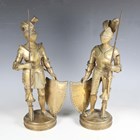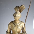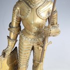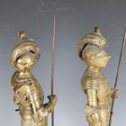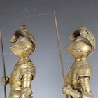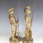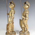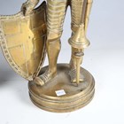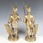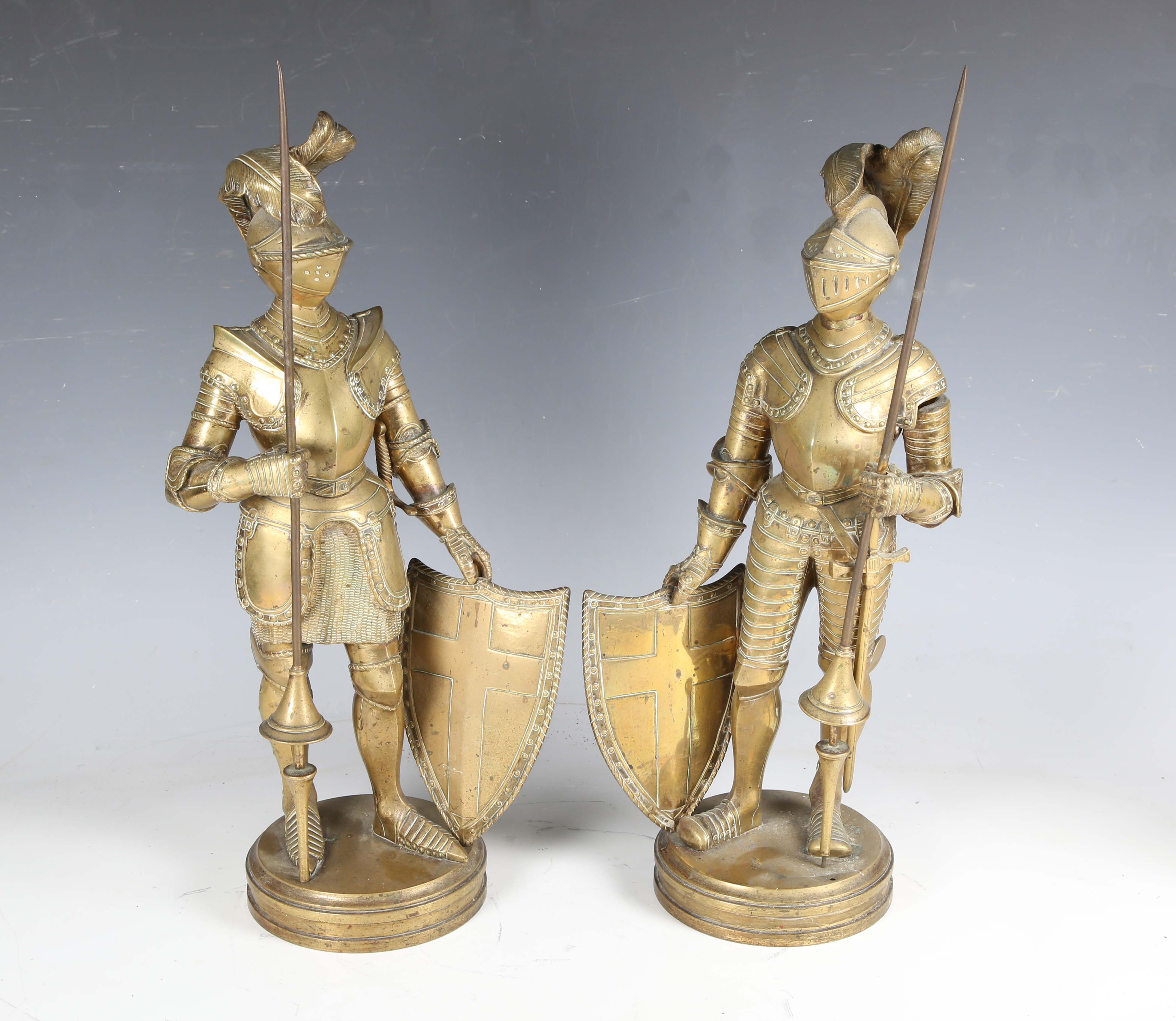 A pair of late 19th/early 20th century cast brass sectional figures of knights in armour, both holding a lance and shield, raised on circular bases, height 52cm (one with loose joints).
