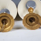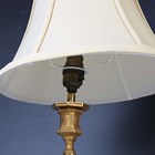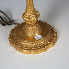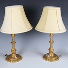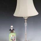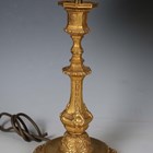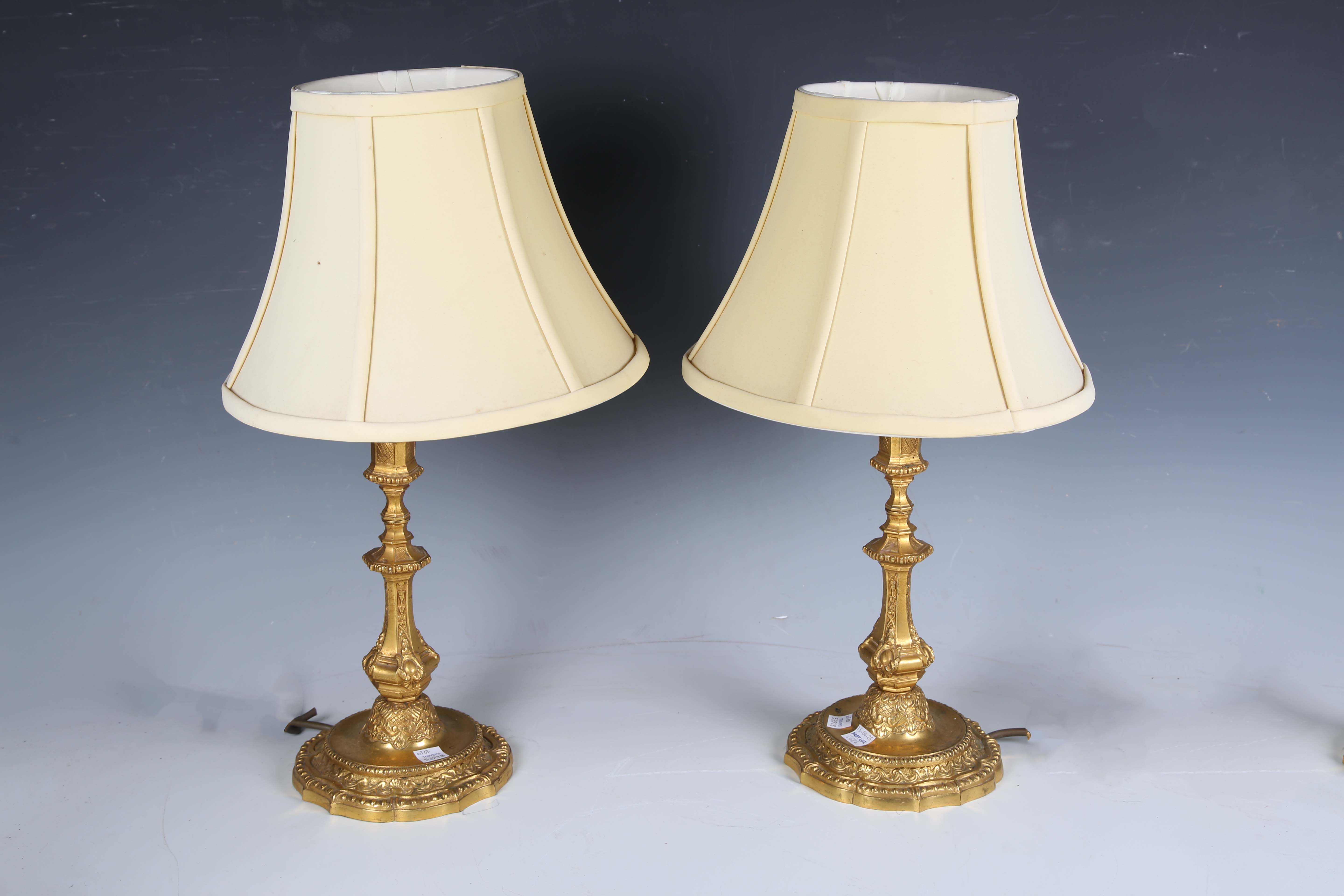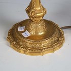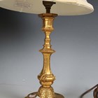 A pair of 19th century French cast ormolu candlesticks, converted to table lamps, height to sconce 25cm, together with a 19th century porcelain lamp base and cut glass table lamp.