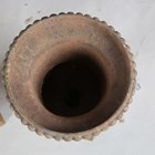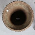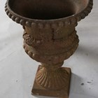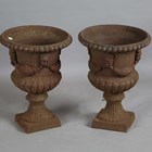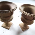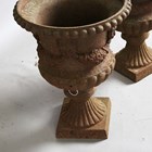 A pair of 19th century cast iron campana garden urns of half-reeded form, raised on flared square bases, height 44cm, diameter 33cm (some faults and detached from bases).