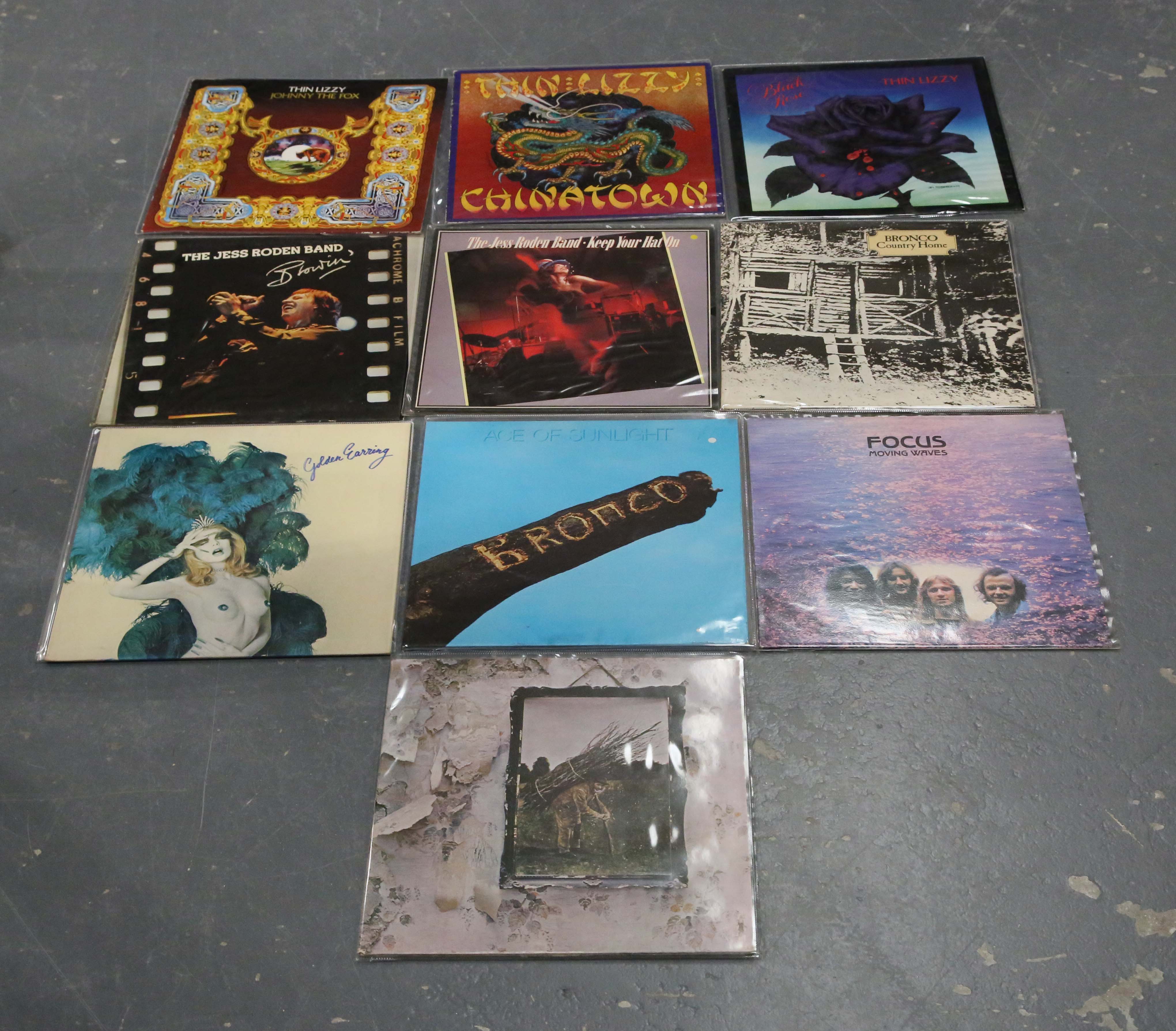 A collection of approximately thirty-one LP records, including Led Zeppelin IV, plum label probable variant 8, early issues of 'The Who Sell Out', 'Tommy' and 'Quadrophenia' by The Who, and albums by Wishbone Ash, Thin Lizzy, Heads, Hands & Feet, and Bronco.