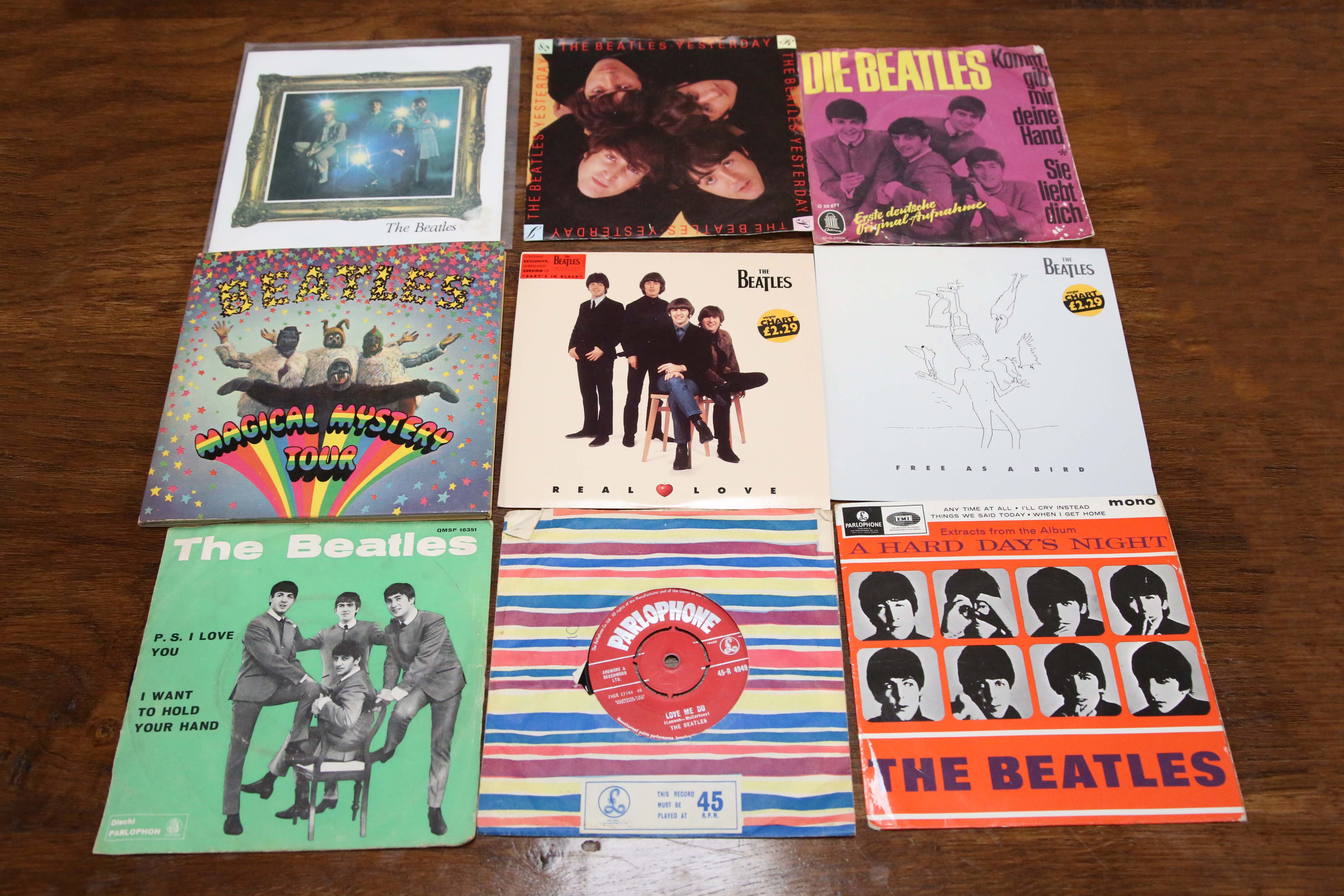 "A collection of approximately forty-two 7"" records by the The Beatles, singles and EPs, including 'Love Me Do' (without 'Made In Gt. Britain' label text), an Italian pressing of 'P.S. I Love You' and 'Extracts from the Album A Hard Day's Night'."