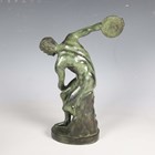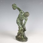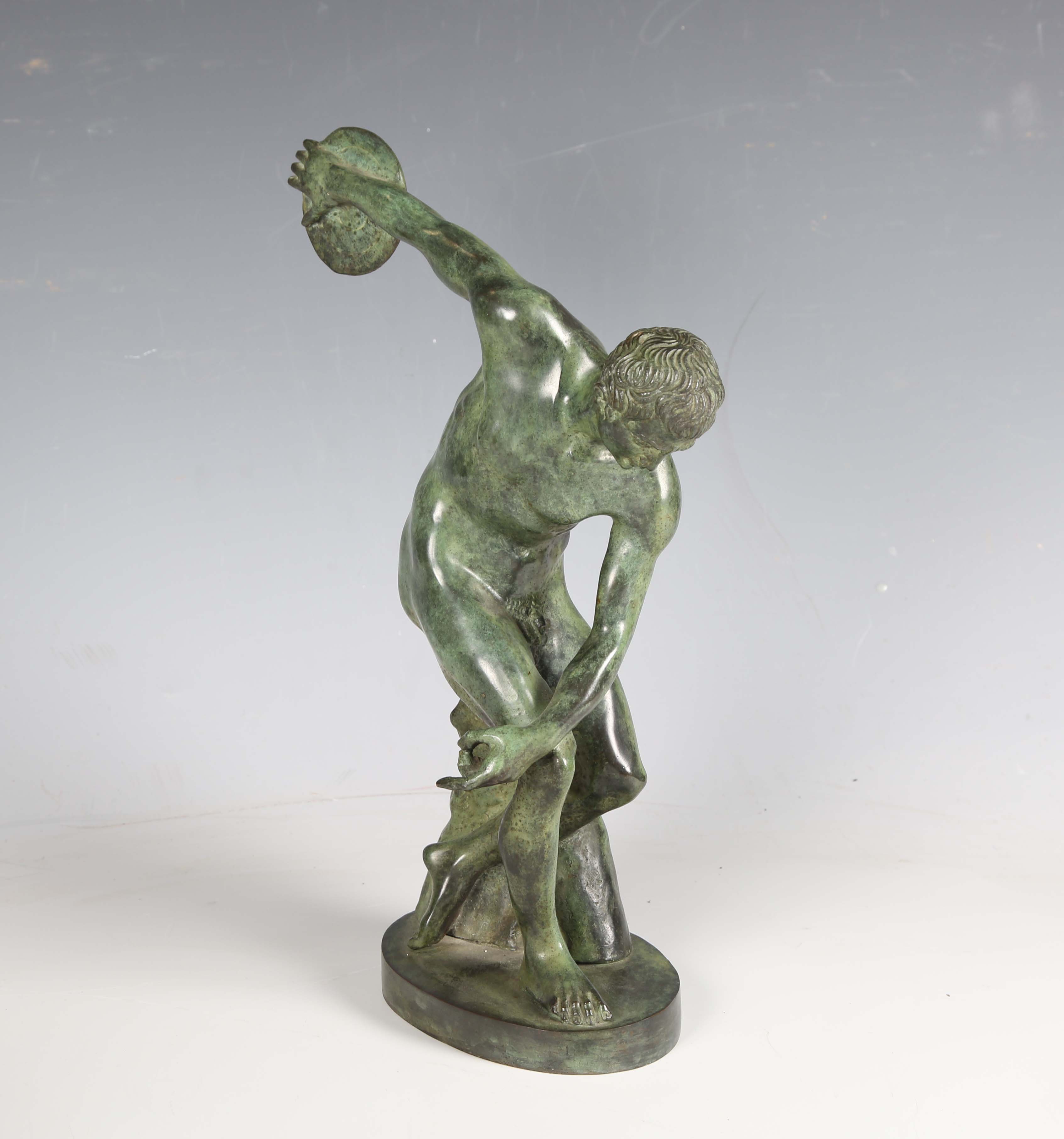 After the antique - a 20th century verdigris patinated cast bronze figure of the Discus Thrower, height 33cm.
