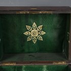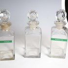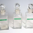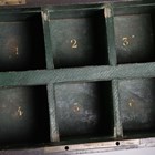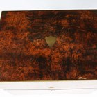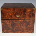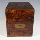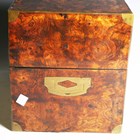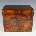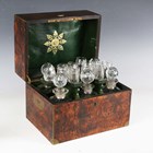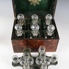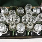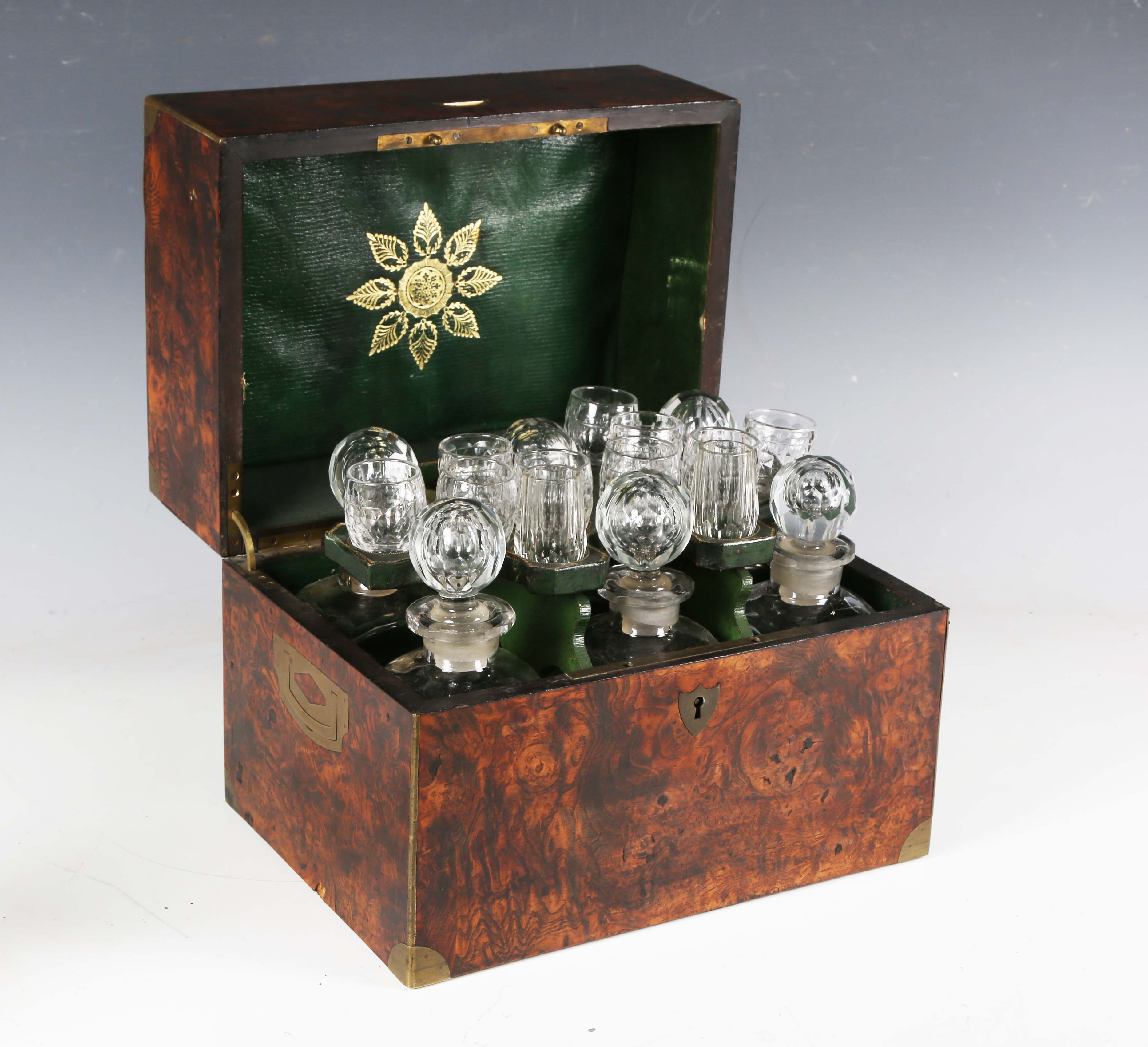 An early Victorian pollard oak and brass bound six-bottle tantalus, the sides with recessed handles, the interior with a set of six cut glass decanters and a partial set of glasses, width 30cm (some faults).