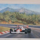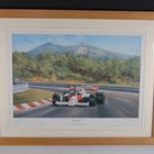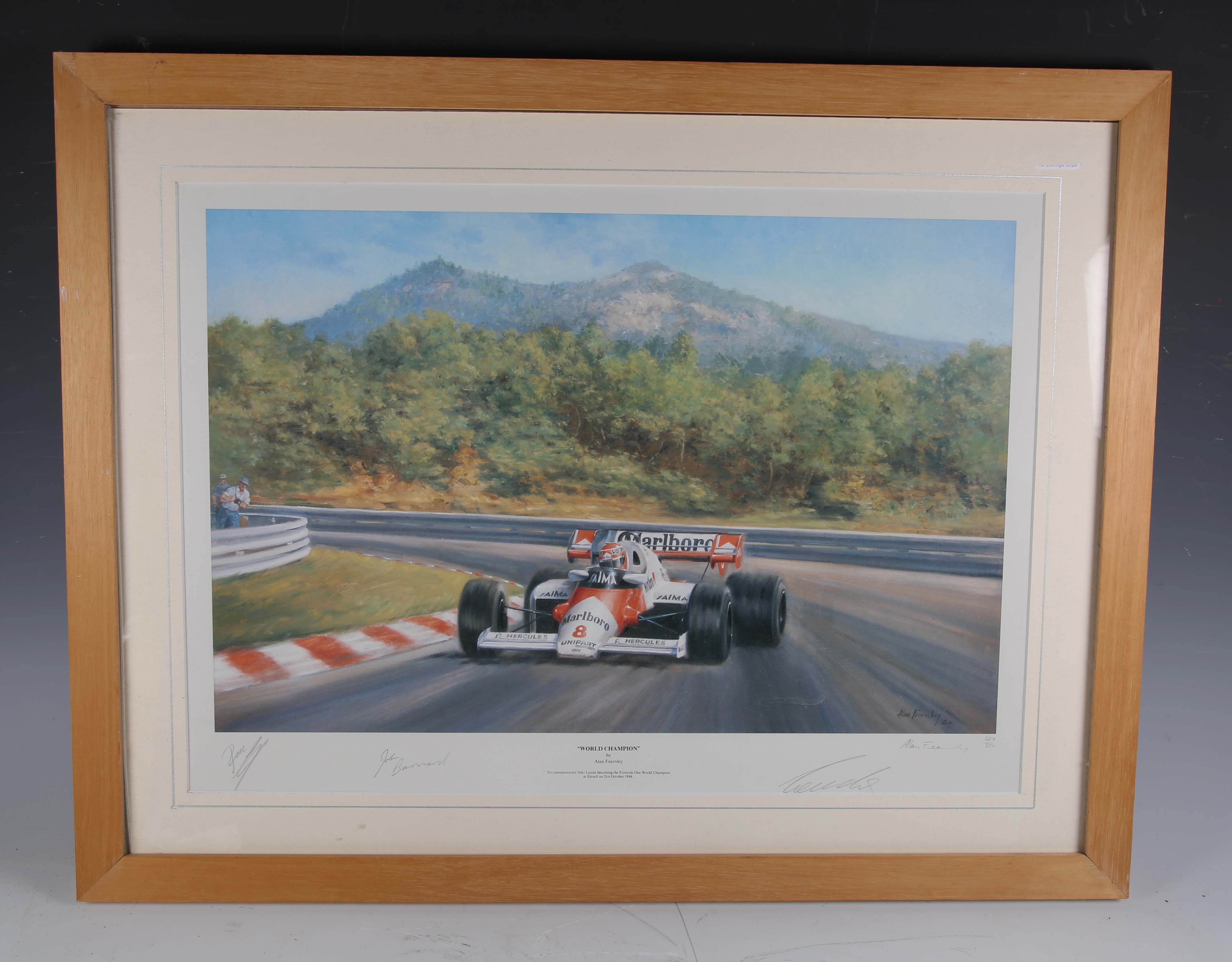 After Alan Fearnley - 'World Champion', limited edition colour print, signed in pencil by the artist, Niki Lauda, John Barnard and Ron Dennis, 42cm x 59cm, framed.