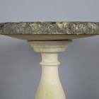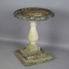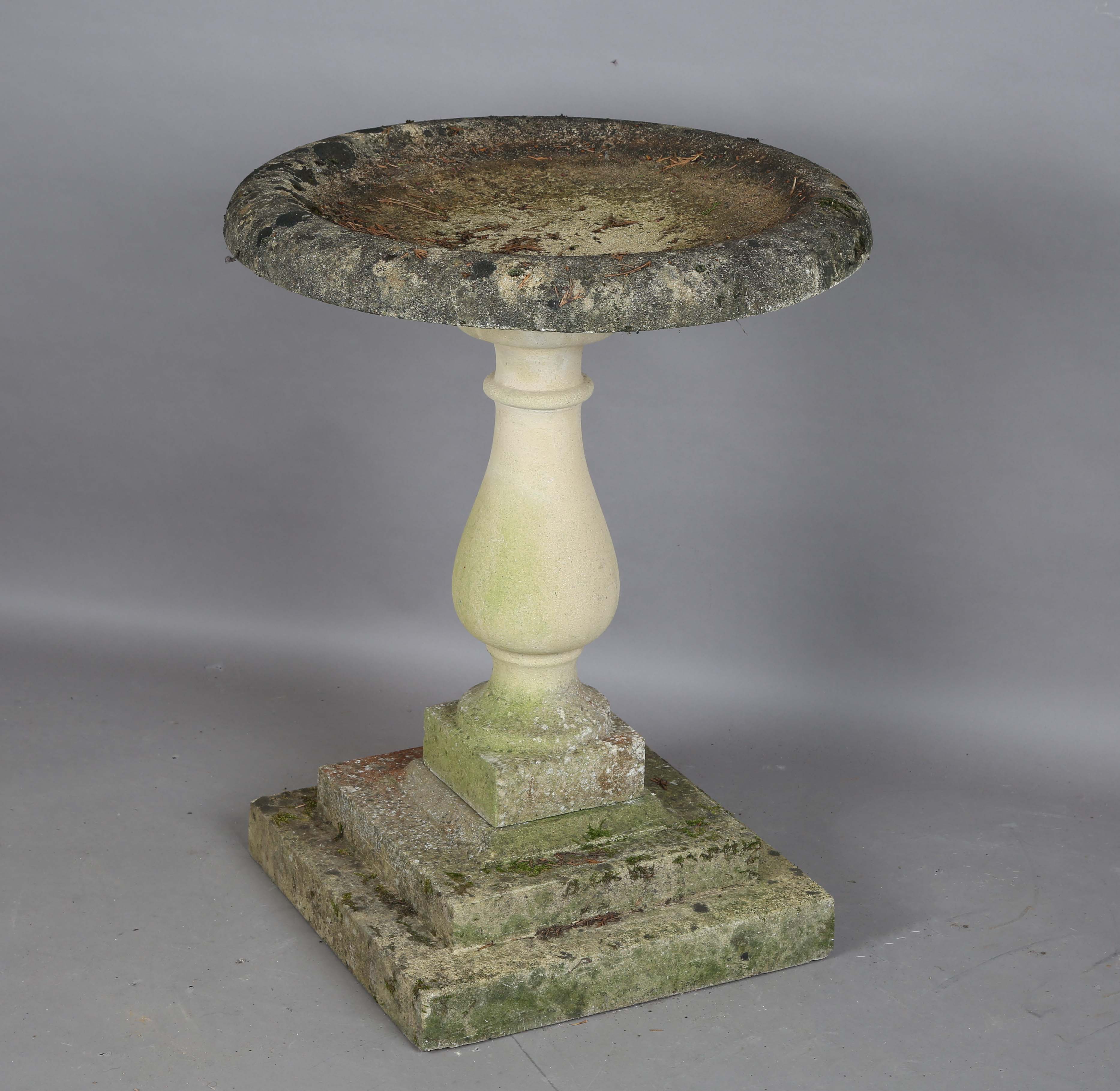A 20th century cast stone garden birdbath with a wide circular bowl on a baluster stem, height 78cm, diameter 61cm.