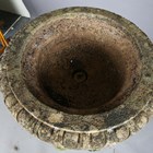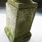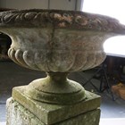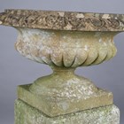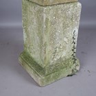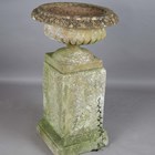 A 20th century cast stone garden urn of squat campana form, raised on a square plinth, height 100cm, diameter 58cm.
