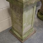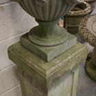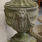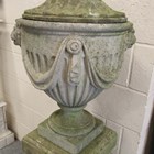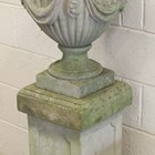 A 20th century Haddonstone cast stone 'Swagged Adam' garden urn and cover, raised on a square section pedestal, height 150cm, width 40cm.