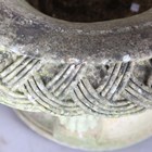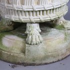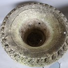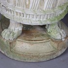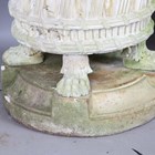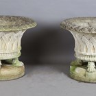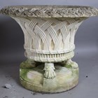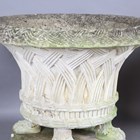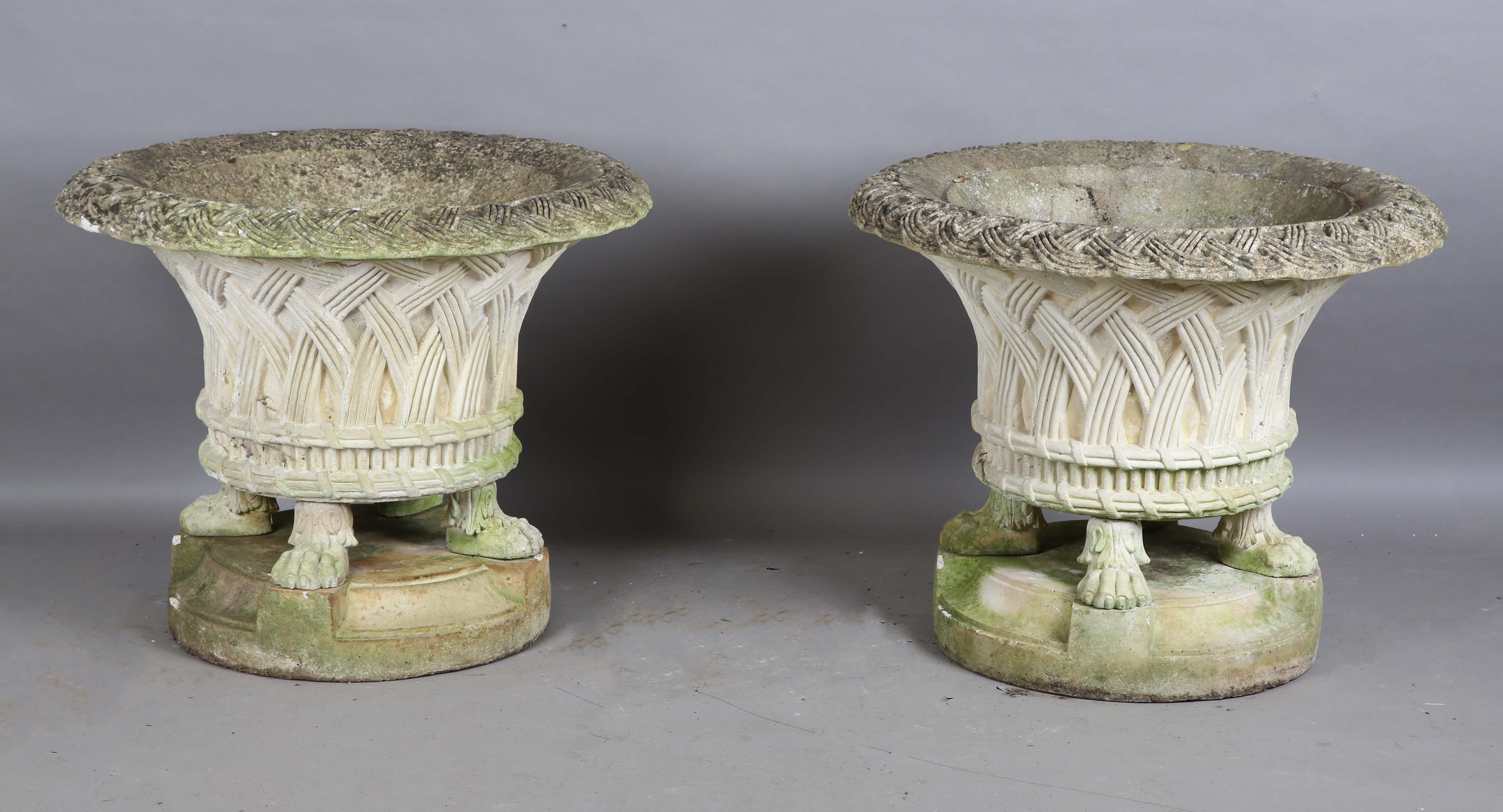 A pair of large 20th century cast stone garden urns, possibly by Haddonstone, the flared basket weave bodies raised on claw feet and stepped plinths, height 64cm, diameter 79cm.