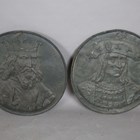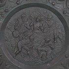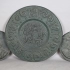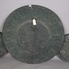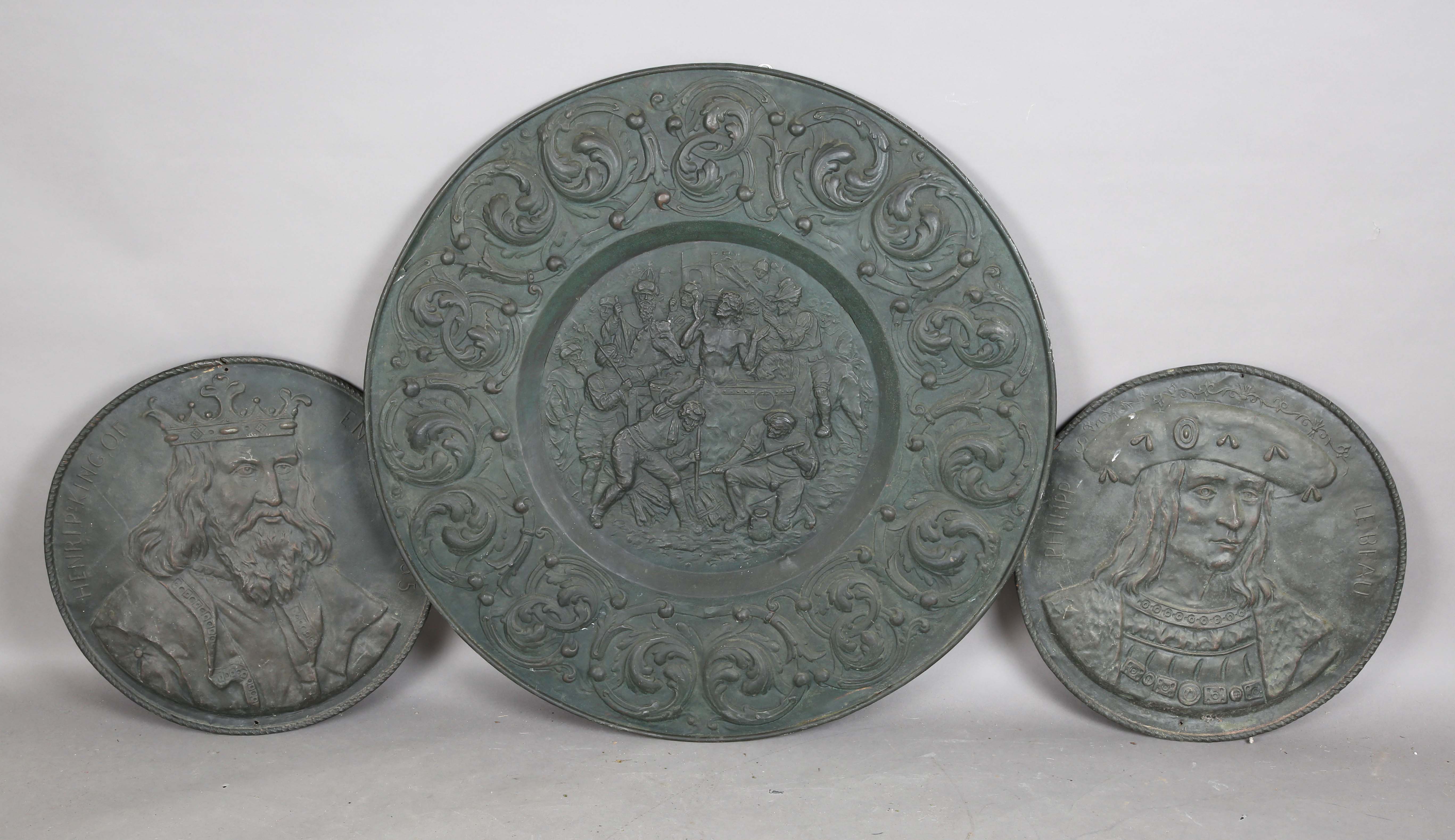 A large 19th century Italian Renaissance style embossed copper charger depicting the scene of Saint John the Evangelist being boiled in a cauldron, diameter 93cm, together with two other copper chargers, embossed with portraits of monarchs.