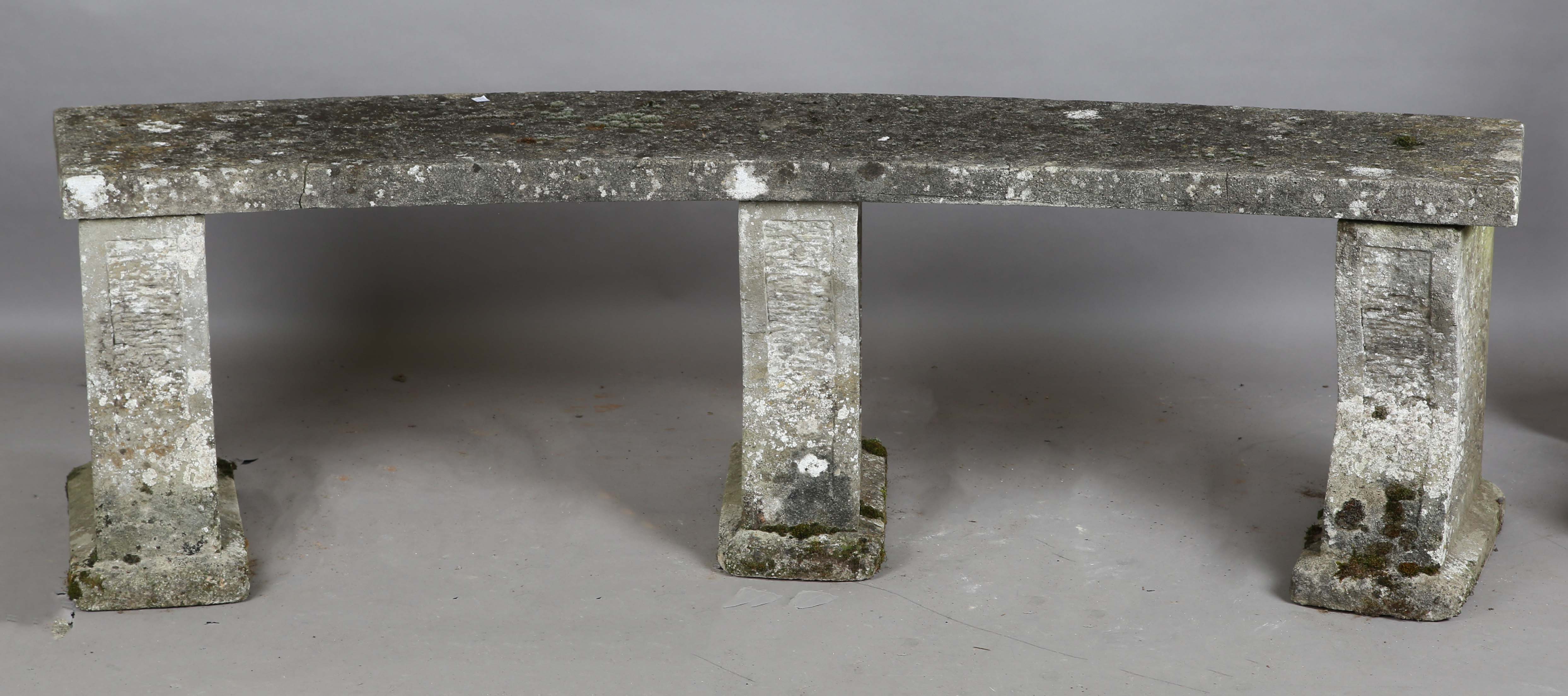 A 20th century cast composition stone garden bench of curved form, height 46cm, width 167cm.
