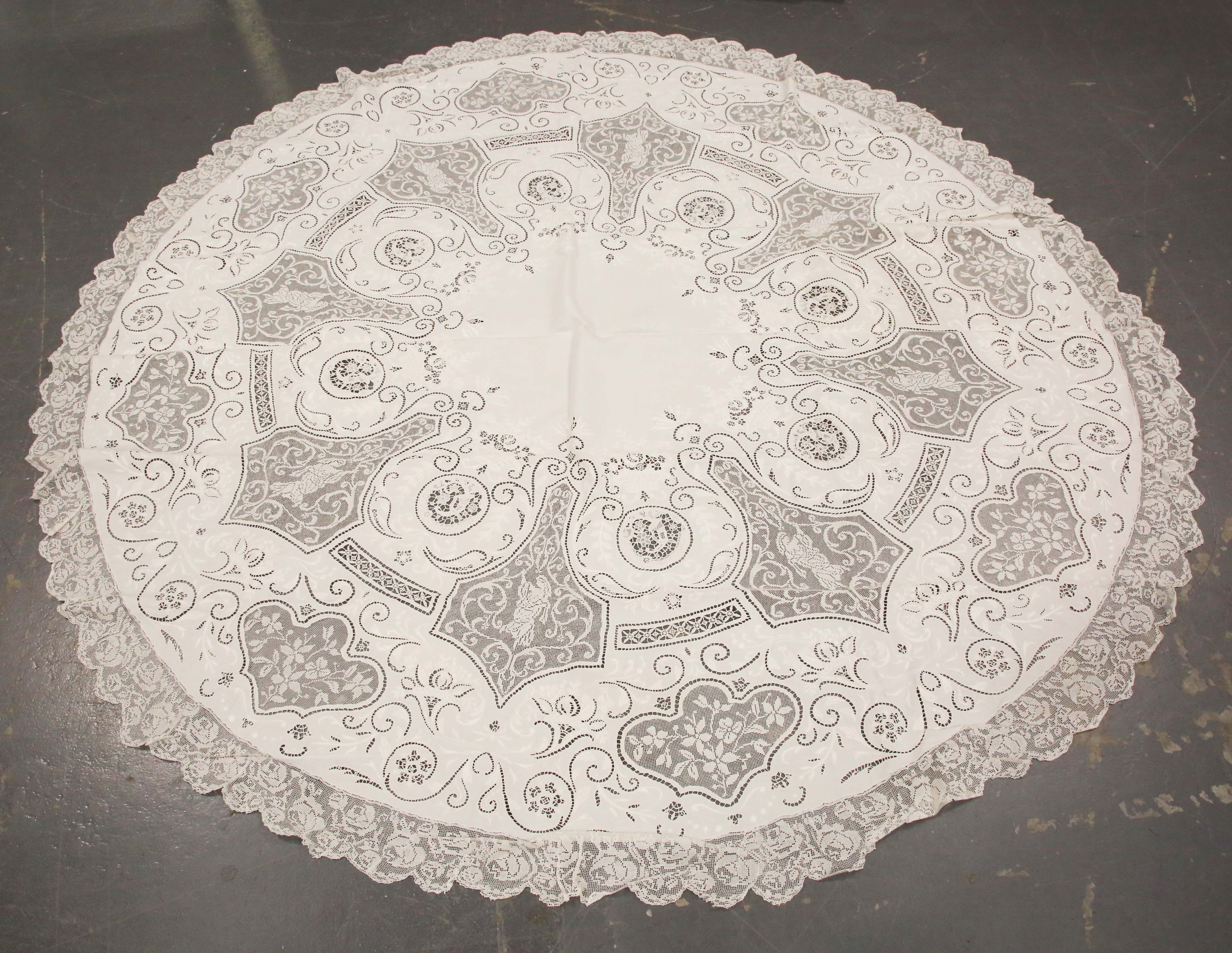 A fine early 20th century Italian linen circular tablecloth with embroidered foliate scrolls and filet lace inserts, diameter 210cm.