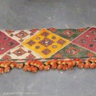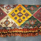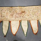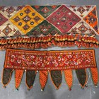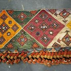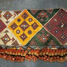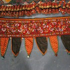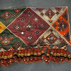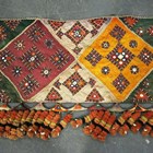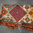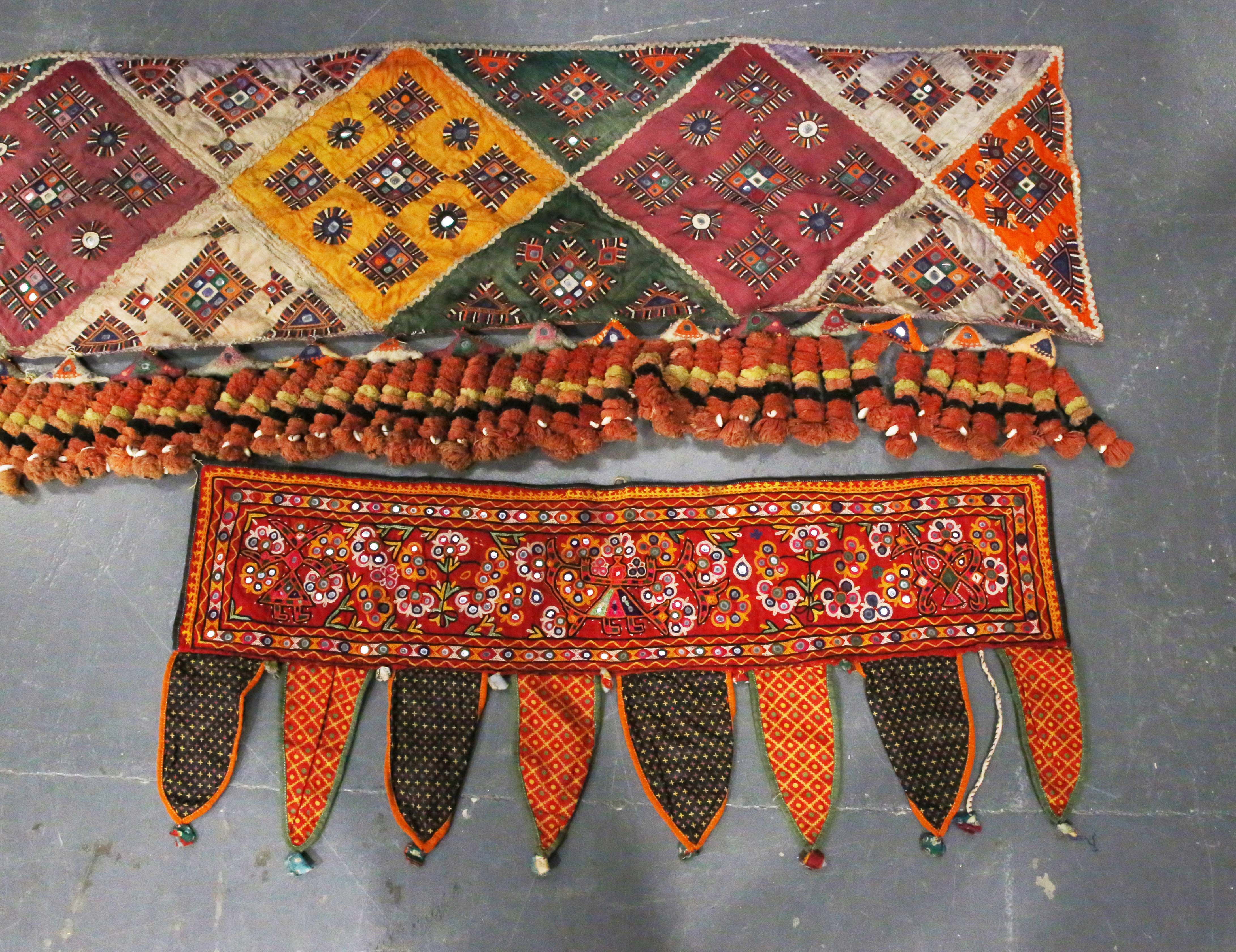 A North Indian Kutch embroidered and mirror inset pelmet hanging, the lower edge hung with woollen tassels, height 65cm, length 370cm, together with another similar hanging.
