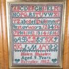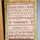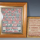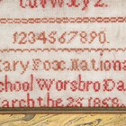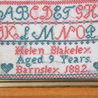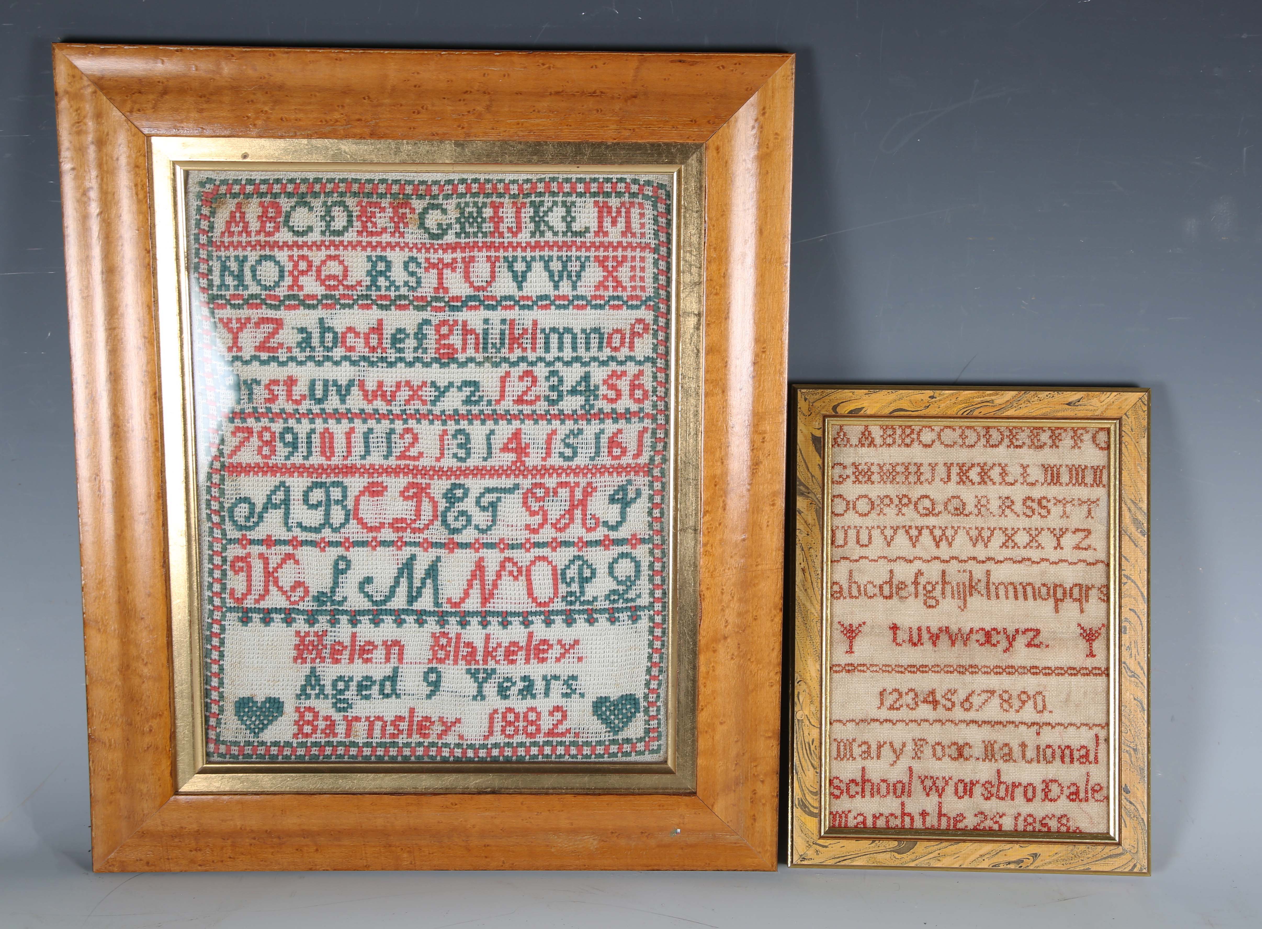 A Victorian needlework sampler by Mary Fox, National School Worsbrodale, dated 1868, 21.5cm x 14.5cm, framed, together with two other Victorian samplers by Helen Blakeley, Barnsley, 1882, and Alice Blakeley, St Georges Girls School, Barnsley, 1883, both approx 31cm x 24cm, framed.