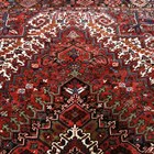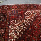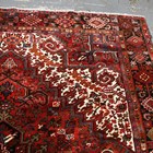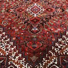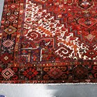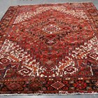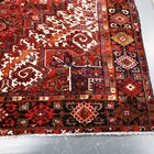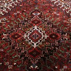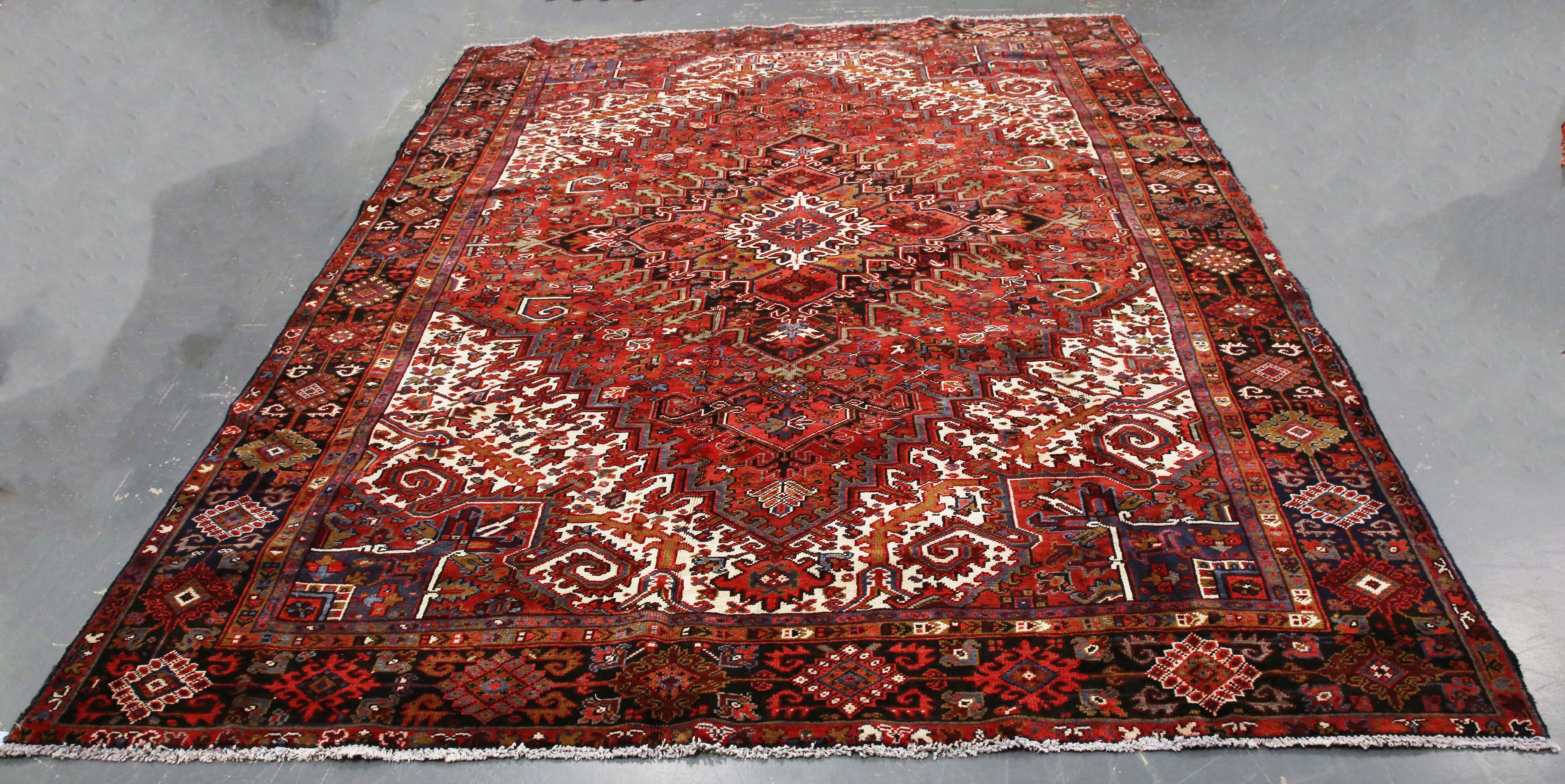 A Heriz carpet, North-west Persia, mid-20th century, the red field with a bold angular medallion, within ivory spandrels and a charcoal palmette and vine border, 340cm x 267cm.