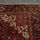 A Heriz carpet, North-west Persia, mid-20th century, the pink field with a bold medallion, supported by angular vines, within a blue complimentary border, 350cm x 250cm.