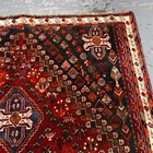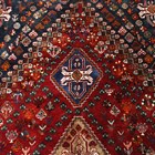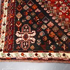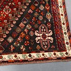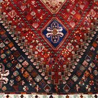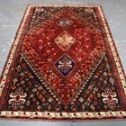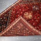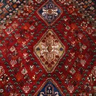 A Ghashghai rug, South-west Persia, late 20th century, the red field with a column of three stepped medallions, supported by overall plants, within an ivory flowering vine border, 243cm x 165cm.