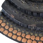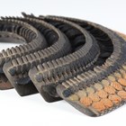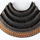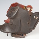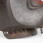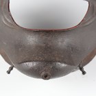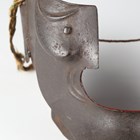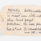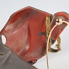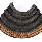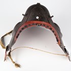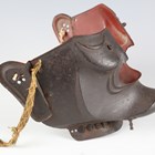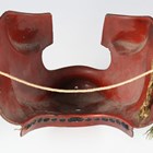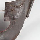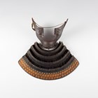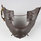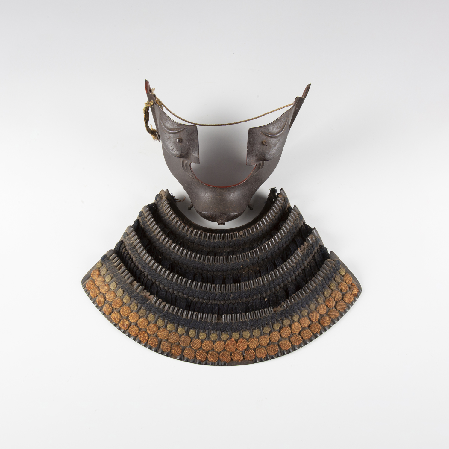 A Japanese steel and lacquered mempo and blue-laced gorget, late 16th century, with heavily stylized features (lacking nose piece) and fabric-laced four-section lacquered throat guard, height 28cm, width 31cm. Provenance: the collection of the late Roald Knutsen (1933-2025); ex H. Russell Robinson Collection c.1959.