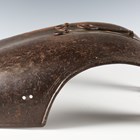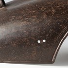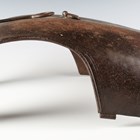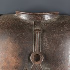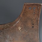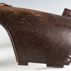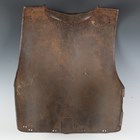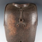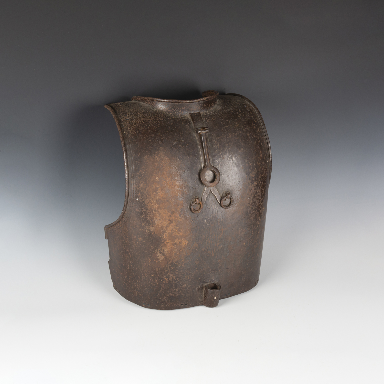 A Japanese all-steel cuirass, pre-Edo period, with reinforced edges and hinged sashimono fittings, the fields with two panels of script and edge with hinge fitting. height 42cm. Provenance: the collection of the late Roald Knutsen (1933-2025). Note: all-steel cuirasses became popular during the early part of the 16th century, when the appearance of firearms on the battlefield gave way to the necessity of more bullet-resistant materials, such as steel. The wearer would need to be aided and essentially locked in, hence the hinge joint to one side. During the more peaceful Edo period, armour became more decorative than functional and these solid steel pieces became redundant. The panels of script are probably a guardianship to the owner.