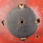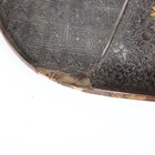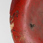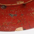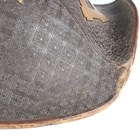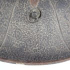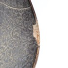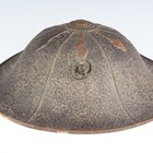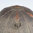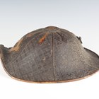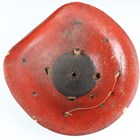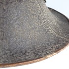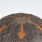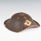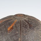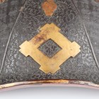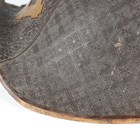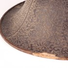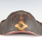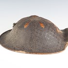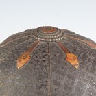A Japanese moulded wood composite and lacquer-decorated jingasa, Edo period, the body with six alternating bands of relief decoration, detailed with floral patterns and geometric star motifs, with applied copper crest finial and moulded radiating arrow-form dividers, the front face with applied household crest of Izutsu of well-head form with brushed gilt finish, the interior decorated with red lacquer and gilt splashed detailing and an arrangement of seven applied metal stud loops, diameter 33cm. Provenance: the collection of the late Roald Knutsen (1933-2025). Note: these types of helmets mainly come from the more peaceful later Edo period, when helmets became more decorative than functional.