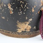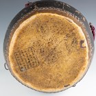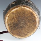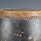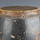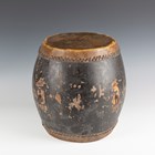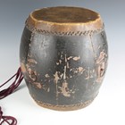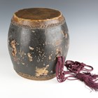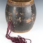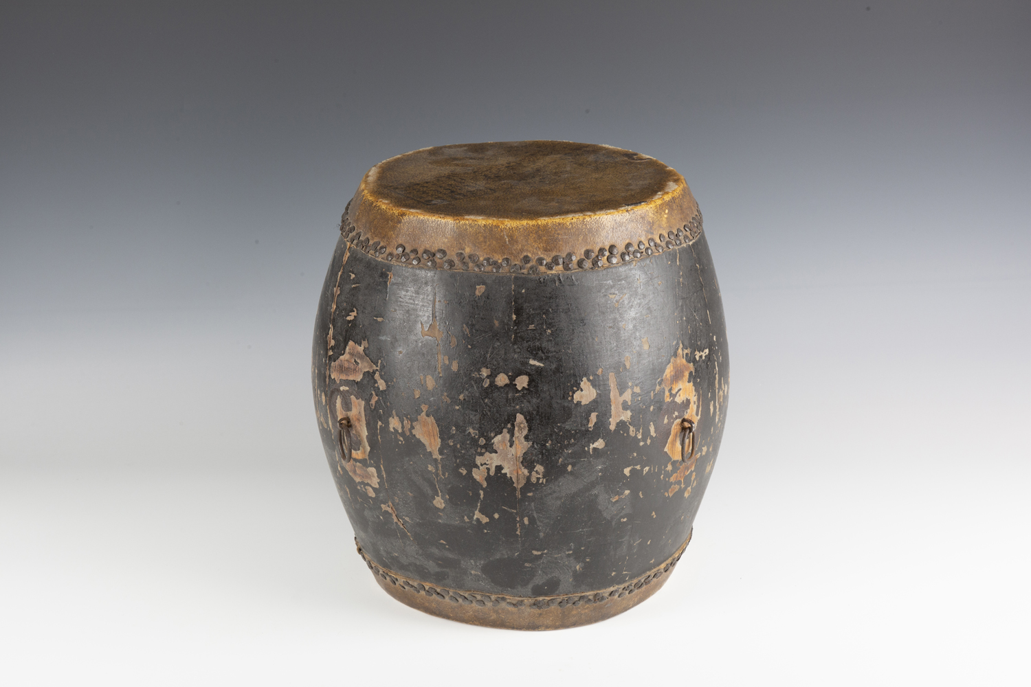 A Japanese samurai taiko or war drum, Edo period, of typical barrel form, the black lacquered wood body with four wrought steel suspensions and stud-fixed hide batter heads with printed seal marks (now indistinct) and later material cord suspension with tassel ends, height 33cm, diameter 32cm. Provenance: the collection of the late Roald Knutsen (1933-2025).