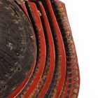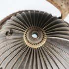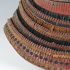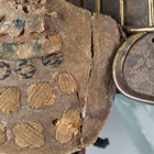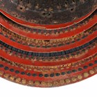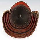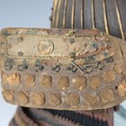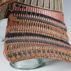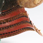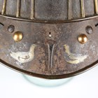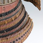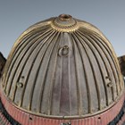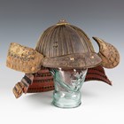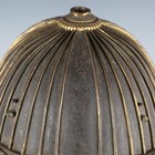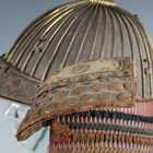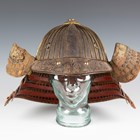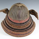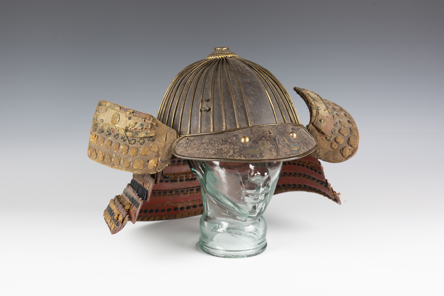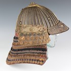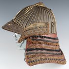 A Japanese suji kabuto, mid-Edo period, the steel skull body divided into thirty-six gilt finished wire divided sections and applied gilt metal helm, the lower body with fukigaeshi and mabizashi or protecting visor, the front with damascened gilt finished household crest or symbol of two facing geese and with shikoro formed of five laced lacquered sections, height 32cm, width 42cm (lacking interior lining, some environmental damage throughout). Provenance: the collection of the late Roald Knutsen (1933-2025).