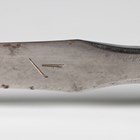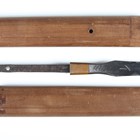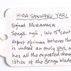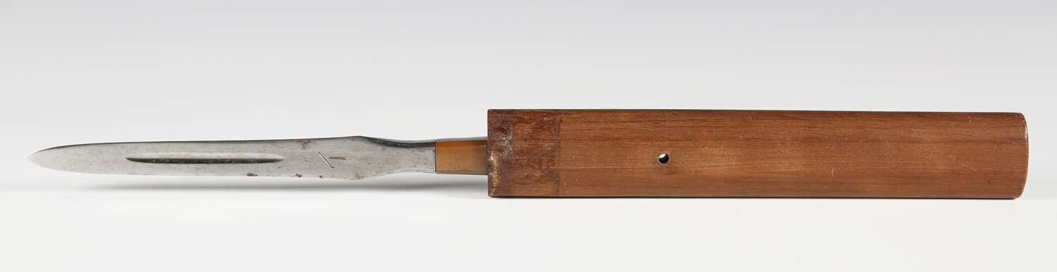 A fine Japanese sankaku-yari or triangular spearhead, probably late 15th century, with triangular-section head, head length 17.5cm, one face with fullered groove and marked with a bonji, the signed tang with double hole piercings, with later wood mounts, overall length 40cm. Provenance: the collection of the late Roald Knutsen (1933-2025); purchased from John Harding, July 1962, for £8. Note: illustrated in ‘Japanese Polearms’ by Roald M. Knutsen, The Holland Press, London: 1963, page 172, figure 35. Roald Knutsen identified the signature as Muramasa and his research showed Muramasa was probably part of the Sengo school of Kuwana in Ise province and probably second generation in the family line.