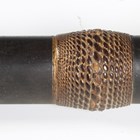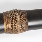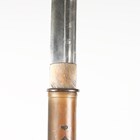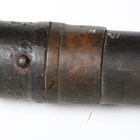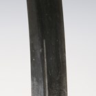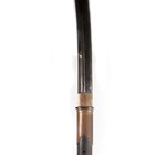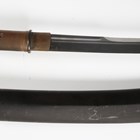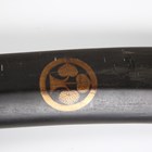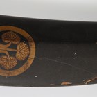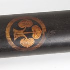 A fine Japanese naginata, Edo period. the curved single-edged blade with fine even hamon, blade length 43cm, fine deep-grooved and formed horimono, curved part-length shinogi and fine ko-shinogi tip, the signed tang fitted to a full-length lacquer-finished shaft with shaped copper mounts and cord binding, detailed with gilt-decorated three-headed plant-form mon, and pierced steel hirumaki terminal, overall length 239cm, the blade with lacquered wood scabbard, detailed to both sides with the same mon. Provenance: the collection of the late Roald Knutsen (1933-2025).