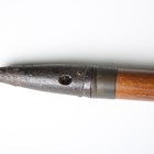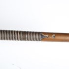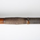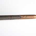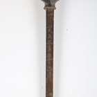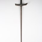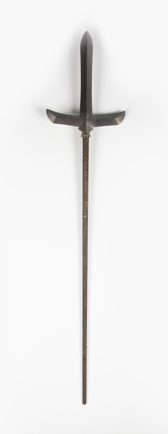 A very fine Japanese magari-yari, late Edo period, with stylistic trident-form head, head length 18cm, the fine long tang with double hole piercings and signed to both faces, mounted on a pear-section light oak shaft, the upper grip section of corrugated black lacquer and gilt rattan with copper metal collars and hirumaki terminal, overall length 278cm, the blade with black lacquer saya. Provenance: the collection of the late Roald Knutsen (1933-2025); purchased from Wallis & Wallis (Fairclough), January 1961, for £4. Note: illustrated in ‘Japanese Polearms’ by Roald M. Knutsen, The Holland Press, London: 1963, pages 138 & 148, plates 18 & 23. Roald Knutsen identified the signature as Bakufu-Shi Kawai Hisayuki (aged 78) Saku, and the date as ‘Bunkyu 3rd year 1st month’ February/March 1863, and noted ‘mint condition, a fine handsome spear’. Hisayuki was a swordsmith of the last shogun’s government in 1863.