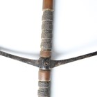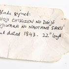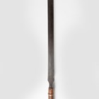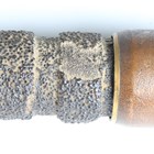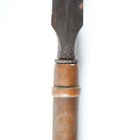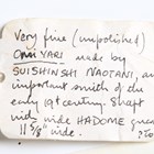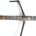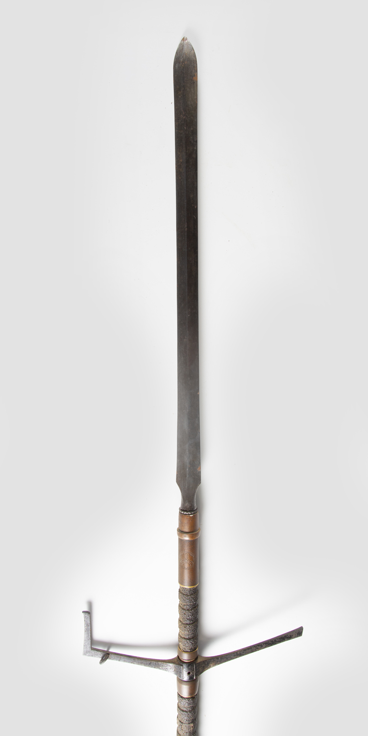 A Japanese su-yari, Edo period, with long leaf-section blade, blade length 56cm, finely signed to two faces, the long tang with single hole piercing and finely signed to two faces, mounted on an oak shaft, the upper grip sections of deep lacquered textured form, with fine textured-finish copper and part-gilt-finished collars, the upper fuchi with household mon, the shaft also mounted with iron hadome and hirumaki terminal, overall length 259cm. Provenance: the collection of the late Roald Knutsen (1933-2025); purchased Portobello 1959 for £1 6s. Note: illustrated in ‘Japanese Polearms’ by Roald M. Knutsen, The Holland Press, London: 1963, page 208, plate 53. Roald Knutsen identified the signature as Suishinshi Naotani and noted that the tang was inscribed ‘Shoji Chikuzen No Daijo Fuji 9 ( Wara) (No) Naotane Saku’ (A Day in the Month 2nd of Tempo 14 1843), and that he was an important smith of the early 19th century.