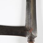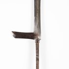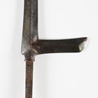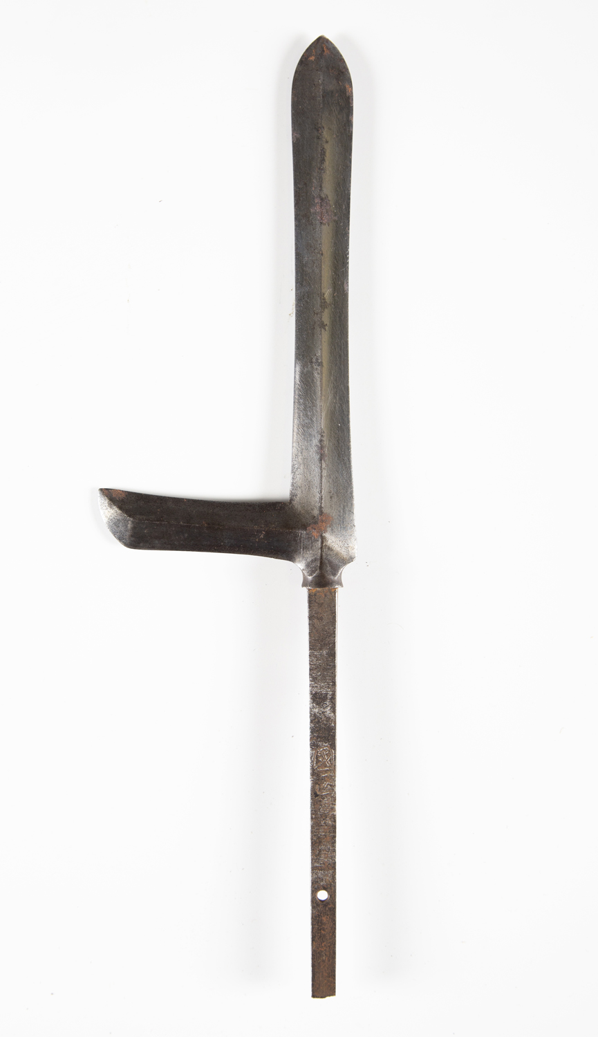 A Japanese hoko, Edo period, with fine L-form blade, blade length 17.5cm, the long tang with single hole piercing and signed to one face, mounted on an oak shaft, the upper grip section of corrugated black lacquer with copper and rattan bindings, the fuchi fitting with household mon, and iron hirumaki terminal, overall length 251cm. Provenance: the collection of the late Roald Knutsen (1933-2025); ex H. Russell Robinson Collection 1959, purchased for £2. Note: illustrated in ‘Japanese Polearms’ by Roald M. Knutsen, The Holland Press, London: 1963, page 156, plate 27. Roald Knutsen identified the signature as Kunimasa, probably 17th/18th century, but noted that there were twenty-four recorded smiths with this name.