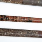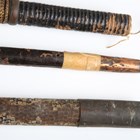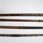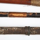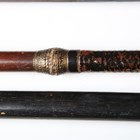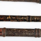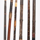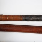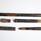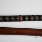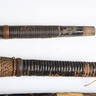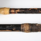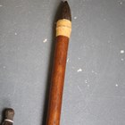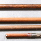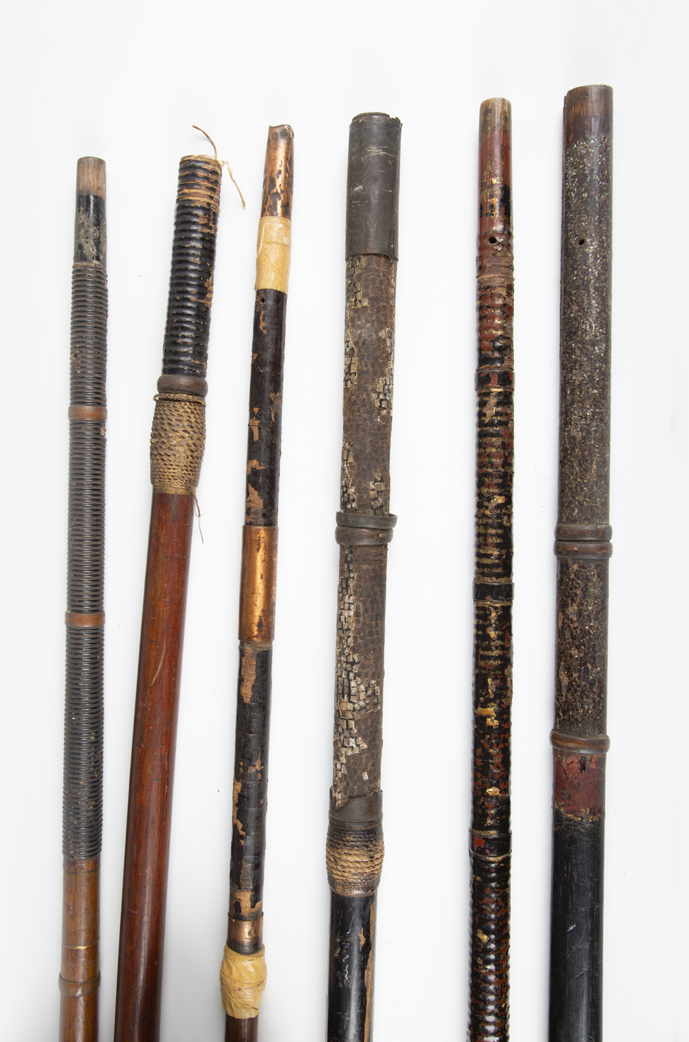 A collection of Japanese wooden spear shafts, Edo period, some detailed with mother-of-pearl decoration and various copper fittings, with various shaped iron hirumaki terminals, length of longest 221cm, together with a small group of other cut-down shaft sections. Provenance: the collection of the late Roald Knutsen (1933-2025). Note: some of these hirumaki are illustrated in ‘Japanese Polearms’ by Roald M. Knutsen, The Holland Press, London: 1963, pages 204 and 206, plates 51 and 52. They were probably used by Roald Knutsen for research.