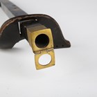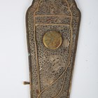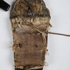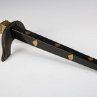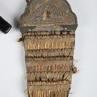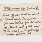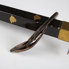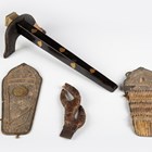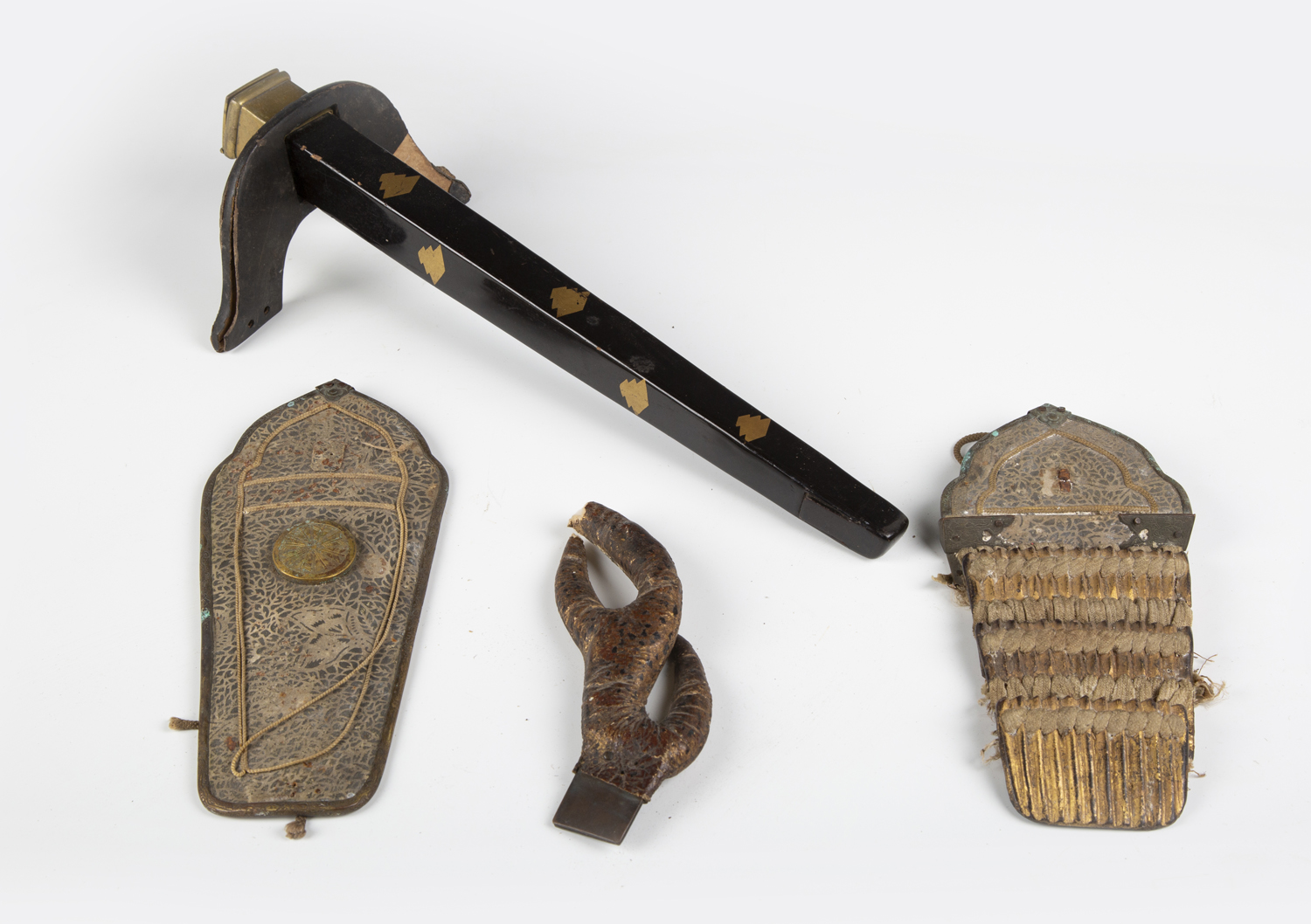 A scarce Japanese sashimono-no-bukuro, Edo period, the fine square-section black lacquered body with gilt copper hinged lid and decorated with seven gilt painted mon, with winged support bracket, height 34.5cm, together with an unusual gilt-finished stitched leather maedate or helmet symbol in the form of a claw-like motif, height 16cm, and two matching higher ranking officers’ shoulder fittings or plates, one of steel construction with applied fine gilt metal mon and border mounts supporting a paper-like material ground, decorated with foliate trellis designs, the other similar but with fabric-bound three-section lacquered scales, length 22cm (all with environmental damage). Provenance: the collection of the late Roald Knutsen (1933-2025). Note: sashimono-no-bukuro were storage containers for sashimono, small banners worn on the back of armour to identify households on the battlefield.