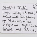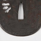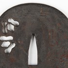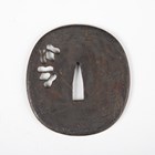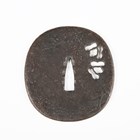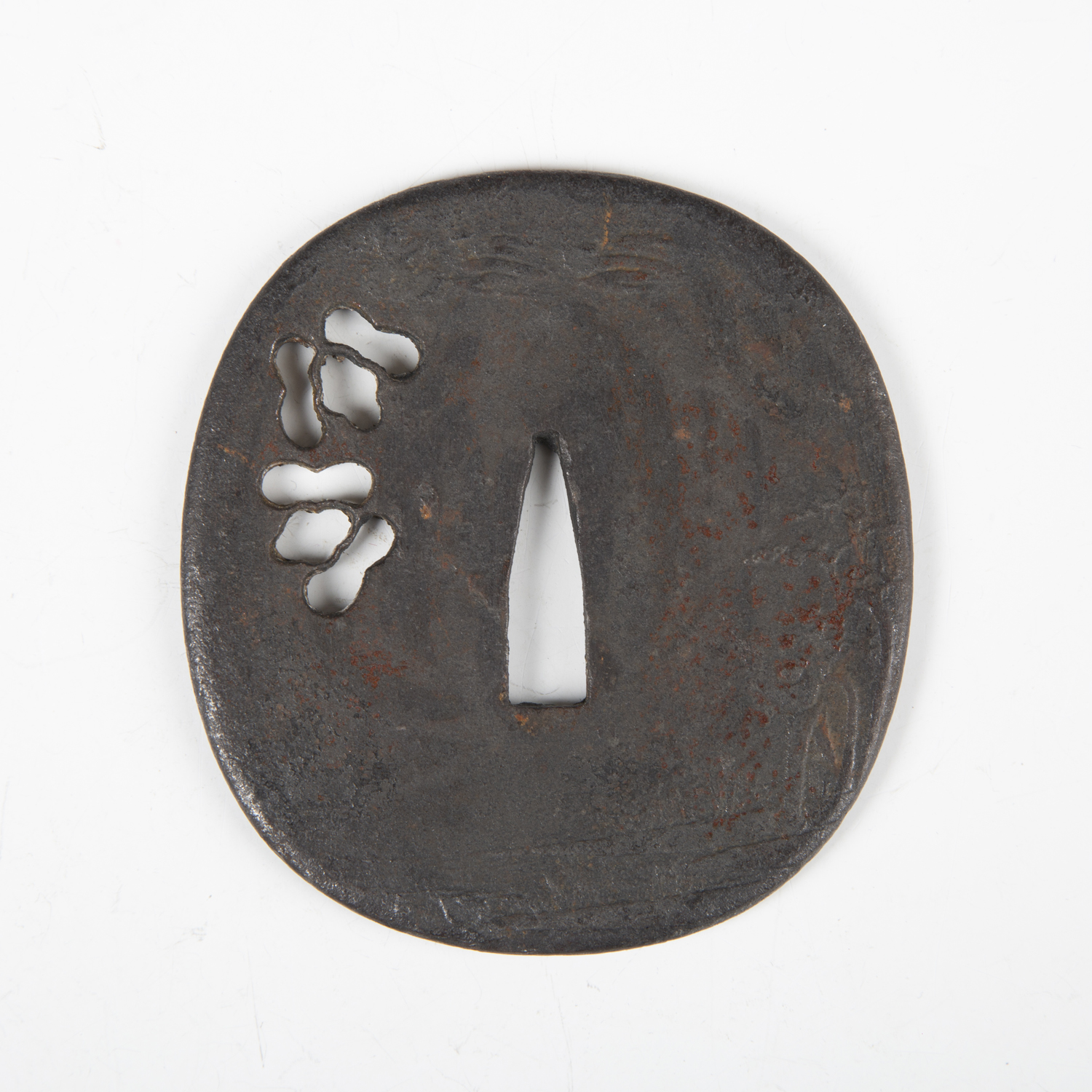 A Japanese oval shaped circular iron tsuba, probably Edo period, with sukashi type openwork decoration, comprising two gourd-like motifs over a subtle naturalistic landscape field, unsigned, 8cm x 9cm. Provenance: the collection of the late Roald Knutsen (1933-2025). Note: Roald and Patricia Knutsen’s research suggested this is possibly Myochin school, mid-16th century.