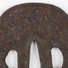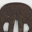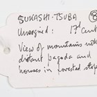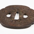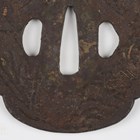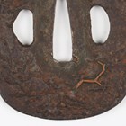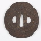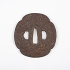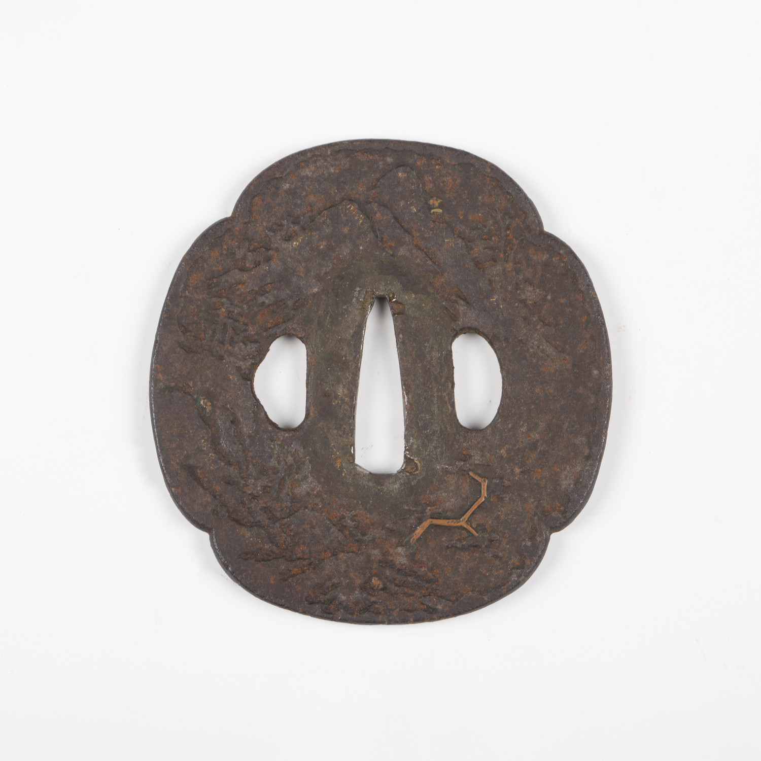 A Japanese shaped oval iron tsuba, Edo period, part-decorated with shakudo style inlay of gilt metal and copper highlighting a mountainous landscape scene with a temple and a pagoda, unsigned, 7.5cm x 8cm. Provenance: the collection of the late Roald Knutsen (1933-2025). Note: probably 17th century.