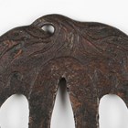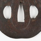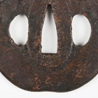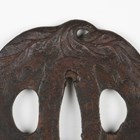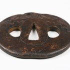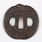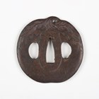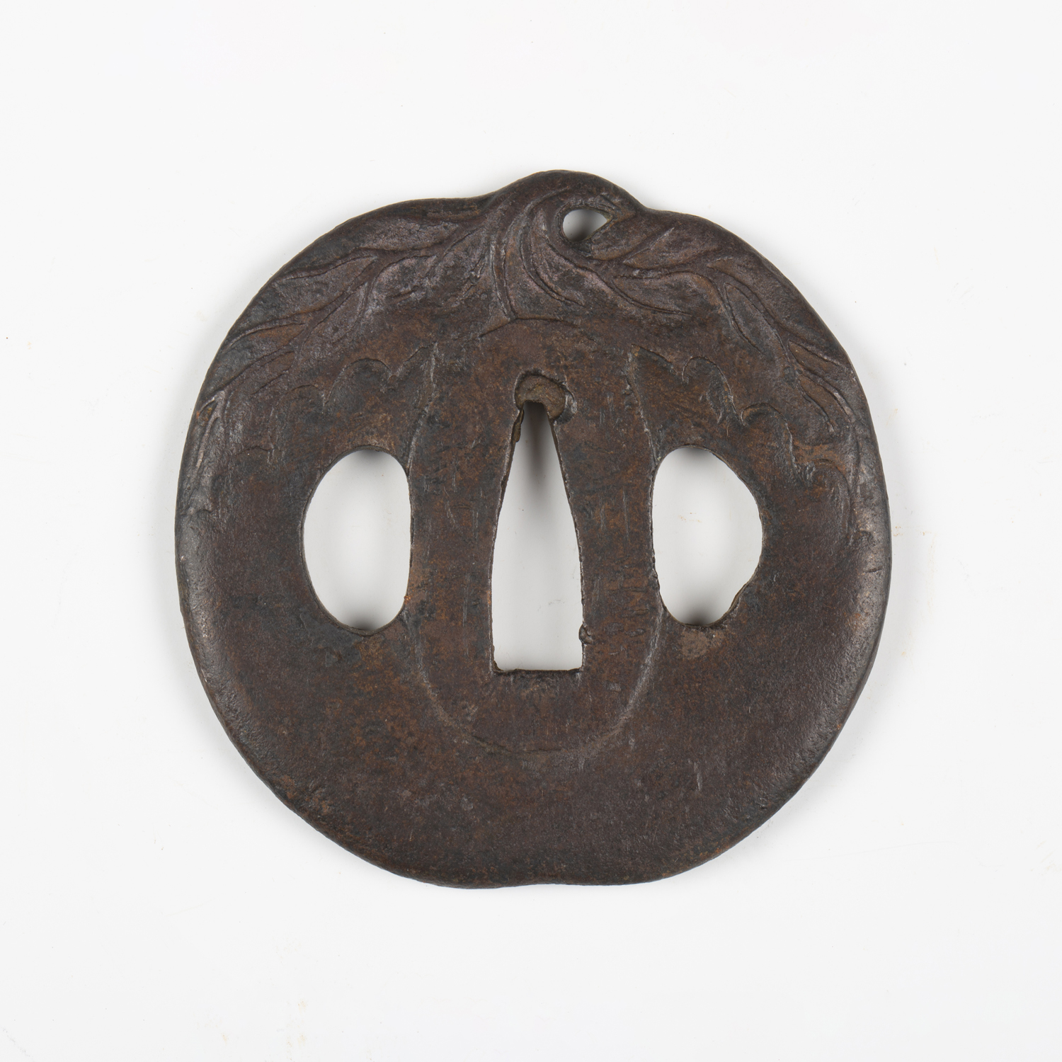 An unusual Japanese oval shaped iron tsuba, Edo period, in the form of an eggplant, indistinctly signed to the centre, 6.7cm x 6.7cm. Provenance: the collection of the late Roald Knutsen (1933-2025); ex Basil Robinson Collection, plate 63. Note: Roald and Patricia Knutsen identified the signature as Odawara-Ryu, probably Owari province, late 17th/early 18th century.
