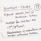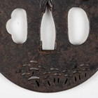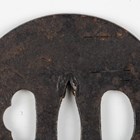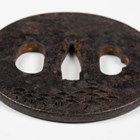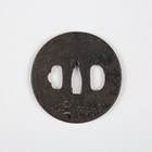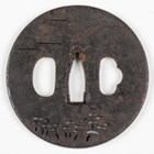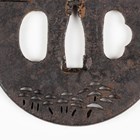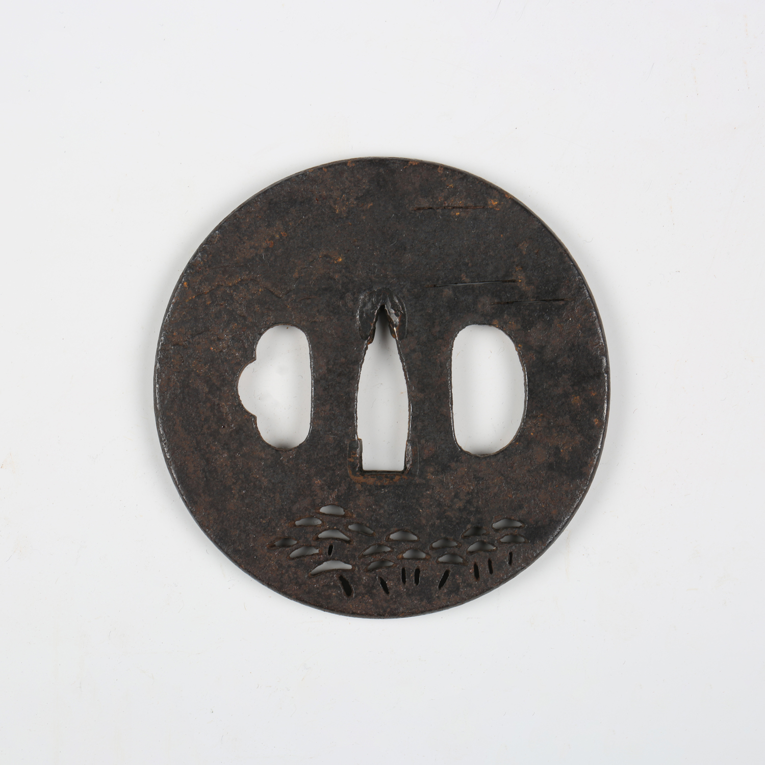 A Japanese circular iron sukashi tsuba, Edo period, with pierced decoration in the form of mushrooms growing in a mountainous valley landscape under a waning moon with three finely pierced horizontal cloud lines, signed, diameter 7.5cm. Provenance: the collection of the late Roald Knutsen (1933-2025). Note: Roald and Patricia Knutsen identified the signature as Inshu (No) Ju Suruga-Saku, who worked for Inaba-Ke, 17th-18th century.