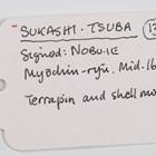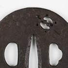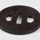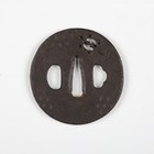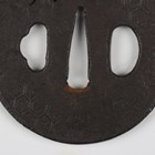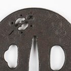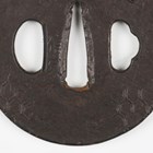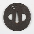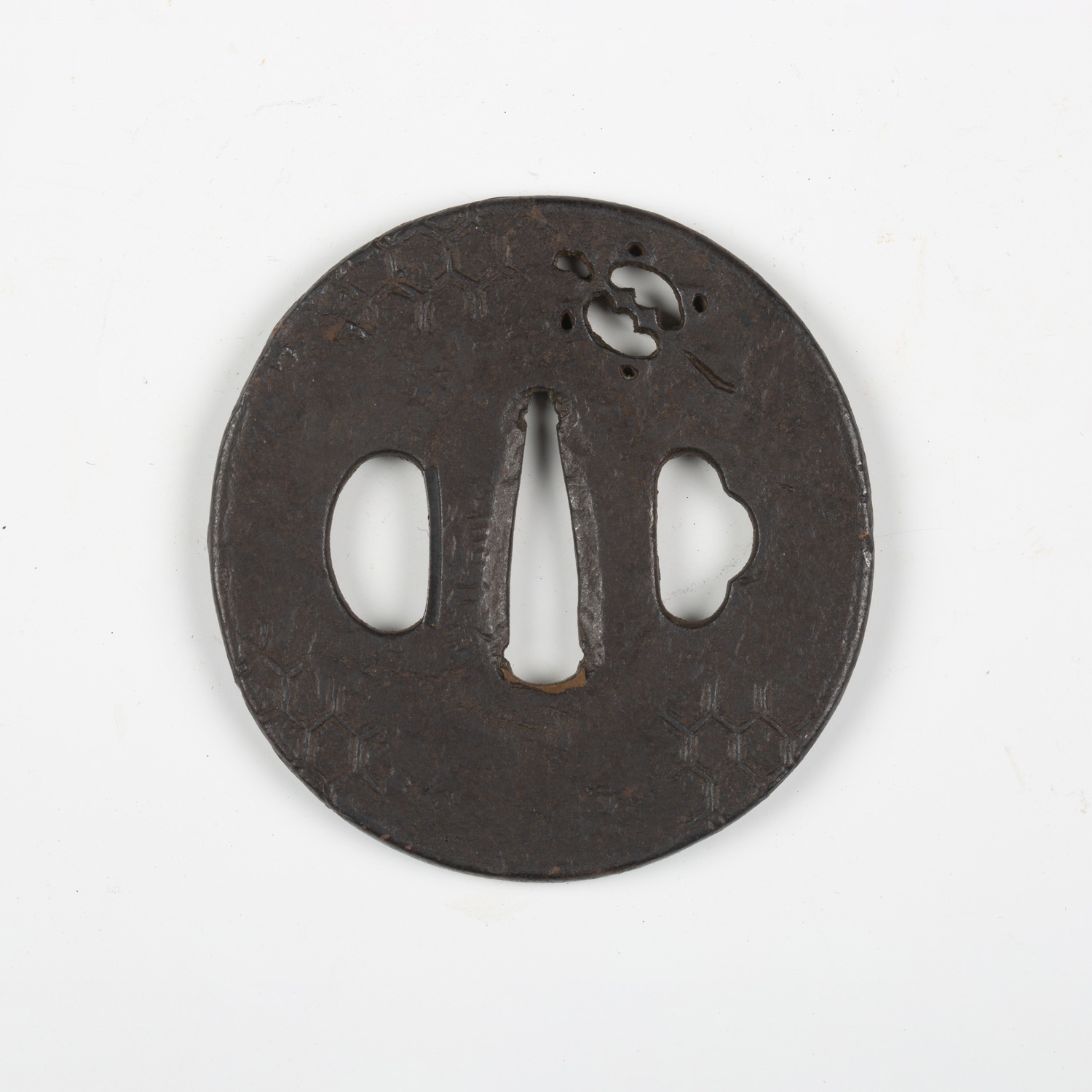A Japanese near-circular iron sukashi tsuba, probably mid-16th century, pierced with a turtle-like creature to the border with interspaced cellular designs to the field, signed, 6.5cm x 6.8cm. Provenance: the collection of the late Roald Knutsen (1933-2025). Note: Roald and Patrica Knutsen identified the signature as Nobuie of Myochin-Ryu, probably mid-16th century.