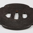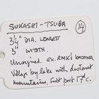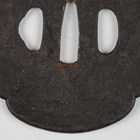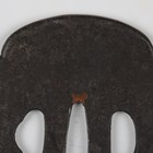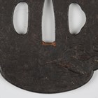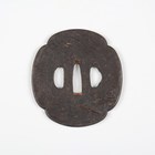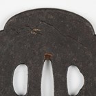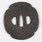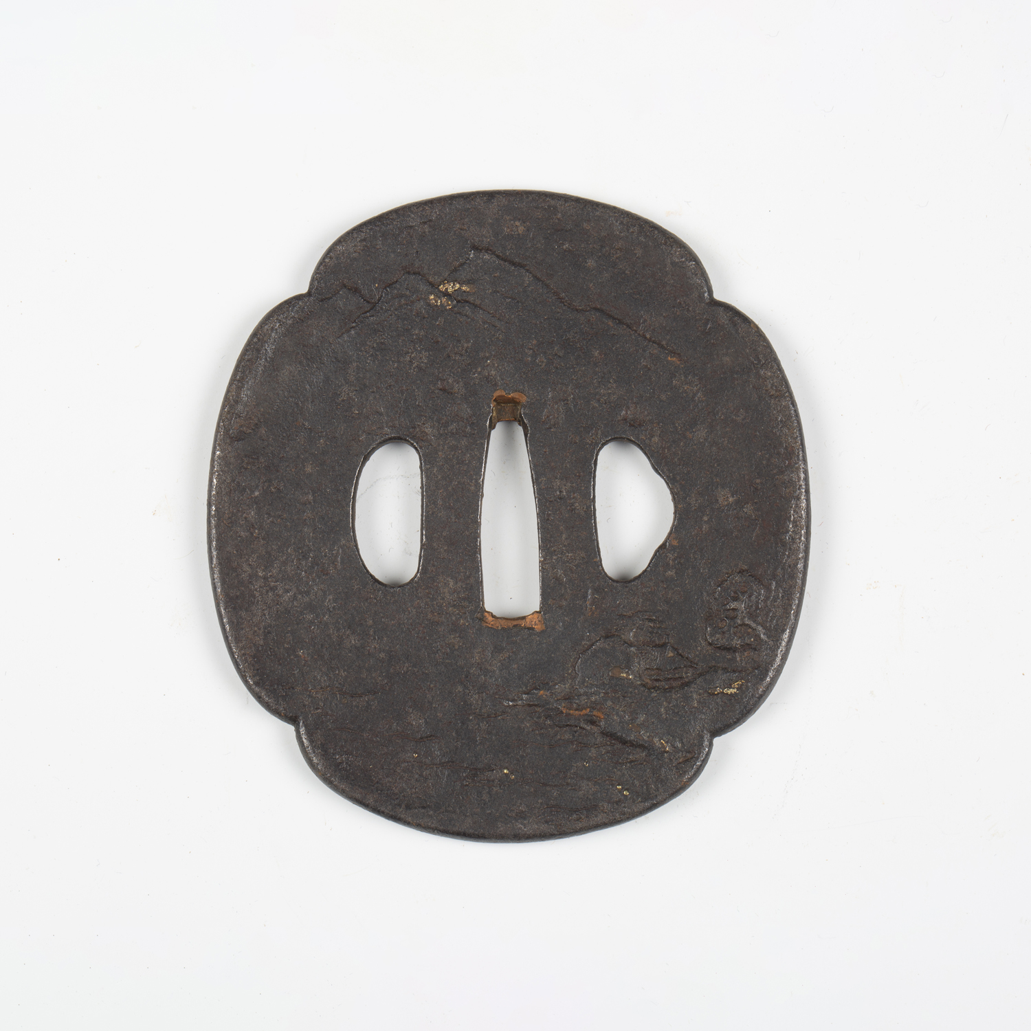 A Japanese shaped oval iron sukashi tsuba, Azuchi–Momoyama/Edo period, decorated with a mountain landscape with lake, unsigned, 7.5cm x 8.3cm. Provenance: the collection of the late Roald Knutsen (1933-2025); purchased from Tom Gregory 1957. Note: dated by Sensei Ozaki Nobushige as 16th-17th century and noted as being the tsuba mounted on Roald Knutsen’s personal katana.